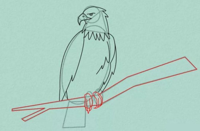 - L'angle est mesuré à l'aide d'un crayon. L'inclinaison des plumes est également mesurée. Dessiner sur des marques pré-positionnées vers le haut de l'animal. L'aile droite est complétée par six plumes. Puis tournez l'aile gauche et la deuxième partie du torse. Sur la tête, mettez clairement en évidence le bec, représentez les yeux. Le point suivant concerne le processus d'application de la peinture.