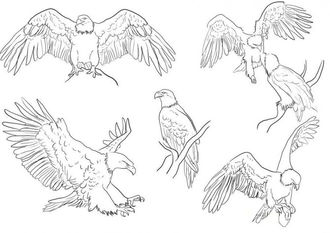En plus de dessiner un aigle, nous parlerons un peu de la structure corporelle et du comportement de l'aigle. Nous montrerons l'oiseau en vol et au sol. En prenant notre leçon comme base, vous pouvez non seulement apprendre à dessiner un aigle, ce que nous vous proposons, mais aussi apprendre à dessiner vous-même l'oiseau dans différentes vues et poses. Commençons.