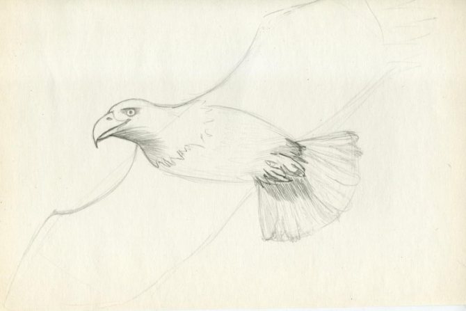 - Ce chiffre peut également être coloré. Le corps et l'aile droite seront plus foncés. Le membre gauche, le plus éloigné, devrait être plus léger - en utilisant le ton pour transmettre la perspective. La tête et les plumes extérieures doivent être plus brillantes et plus claires.