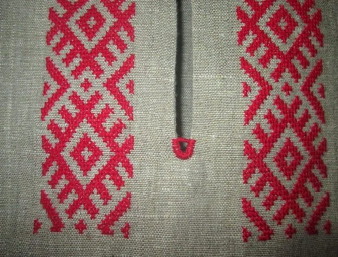 On pense que la broderie décorait les parties du costume par lesquelles, selon nos ancêtres, les forces maléfiques pouvaient pénétrer dans le corps humain. Par conséquent, le principal objectif de la broderie dans les temps anciens était la protection. Le col, les poignets, l'ourlet et l'encolure ont été brodés avec un motif de protection. Le tissu lui-même était considéré comme imperméable aux mauvais esprits, car il était constitué d'objets abondamment recouverts d'ornements incantatoires. Il était donc important de protéger les endroits où le tissu du vêtement se terminait et où le corps humain commençait. Mais surtoutle motif d'un vêtement en disait long sur celui qui le portait. Le motif du vêtement en tant que talisman n'est pas son objectif principal. Votre propre chemise est plus proche de votre corps car elle est comme une peau, juste la vôtre, pour vous et sur vous.
