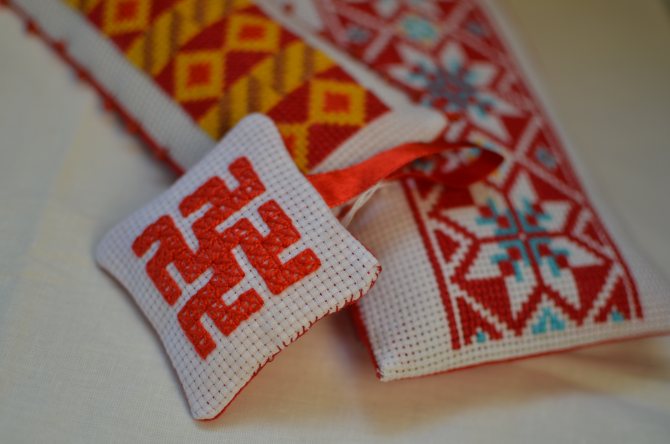 Les images des dieux apparaissent déjà dans les broderies, non plus tant pour la protection que pour le mécénat, avec les jeunes filles comme symboles de fertilité, et les jeunes garçons comme symboles guerriers. Il va sans dire que ni une fille ni un garçon n'en avaient besoin. Outre les broderies sur les vêtements, il existait de nombreuses amulettes d'enfant qui étaient suspendues au-dessus du berceau d'un bébé, du lit d'un garçon ou d'une fille, puis portées sur l'épaule ou à la ceinture. Tout cela ne sert pas seulement à des fonctions de protection et de défense, mais sert aussi de lien entre l'homme et la nature.