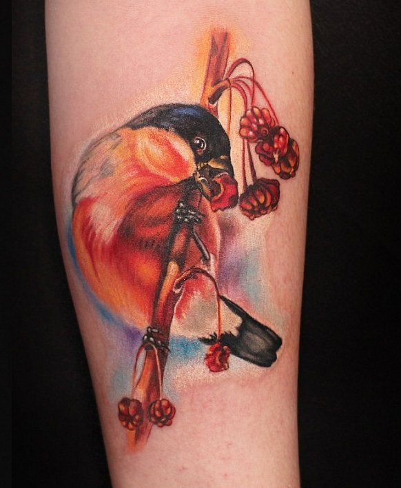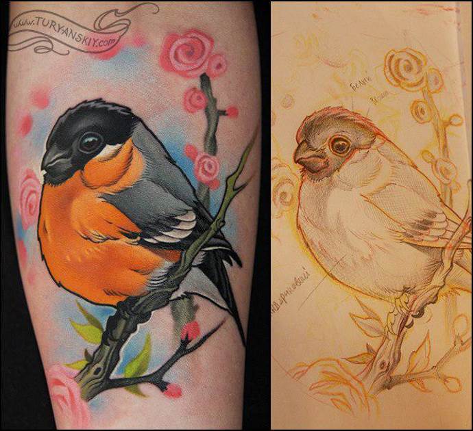 Le tatouage avec l'image d'un bouvreuil est complété par des éléments tels que la neige, des brindilles d'épicéa, une grappe de sorbiers. De même, les oiseaux sont représentés par paires. Cette variante est parfaite pour les personnes romantiques qui ont de l'affection pour leur partenaire. Les bouvreuils sont souvent représentés en train de voler, ce qui symbolise la liberté, la légèreté, l'indépendance et une forte énergie.