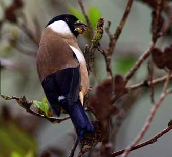 Un habitant de la Sibérie et de l'Extrême-Orient, sans rouge dans son plumage. Les dimensions sont légèrement inférieures à celles du bouvreuil. Le plumage sur le dessus de la tête, autour du bec et des yeux est noir. Les ailes sont noires avec une brillance métallique bleue. Le clypéus et la zone située sous la queue sont blancs.