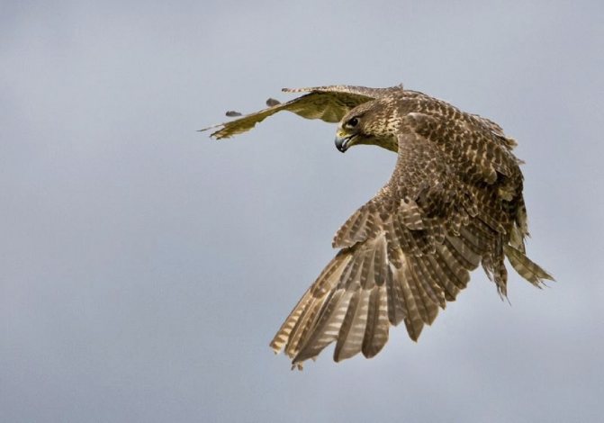Le faucon a un corps puissant avec des ailes fortes et larges. Il a une poitrine large et des membres forts. Le bec a une structure intéressante : un bec court, en forme de crochet, avec une dent pointue au sommet. Il permet de briser les épines des petits oiseaux.