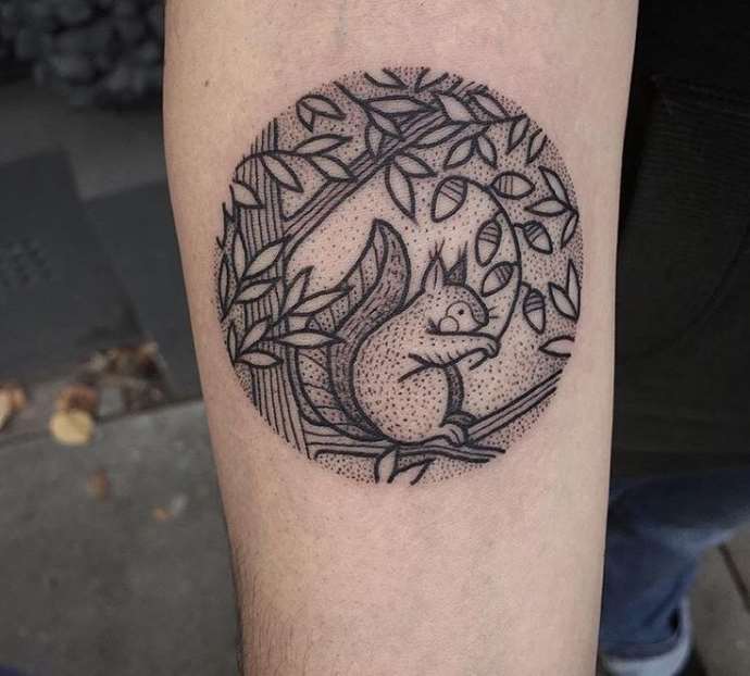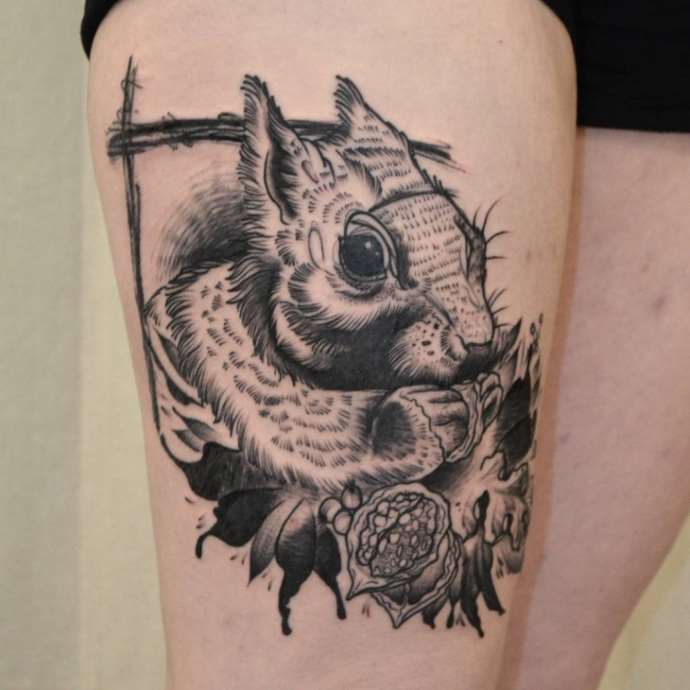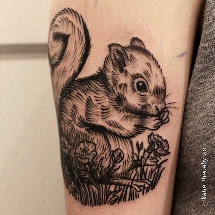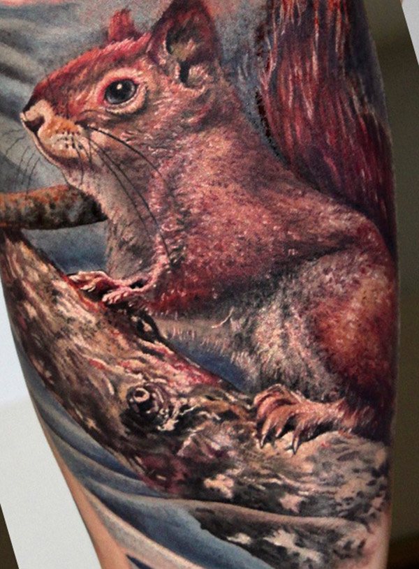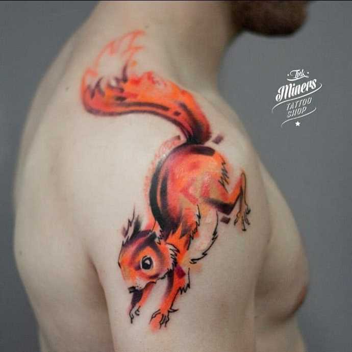 - Les caractéristiques brutes et inachevées du style Art Brut étaient généralement utilisées par des tatoueurs inexpérimentés. Mais par la suite, cette variante s'est transformée en une tendance à part entière capable de véhiculer l'image d'un écureuil de manière charmante. Bien que beaucoup n'aiment pas la qualité de ce tatouage et ne sont pas enclins à le considérer comme bon et acceptable pour un usage personnel ;