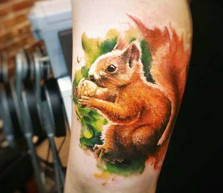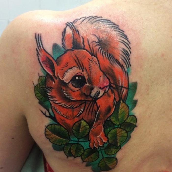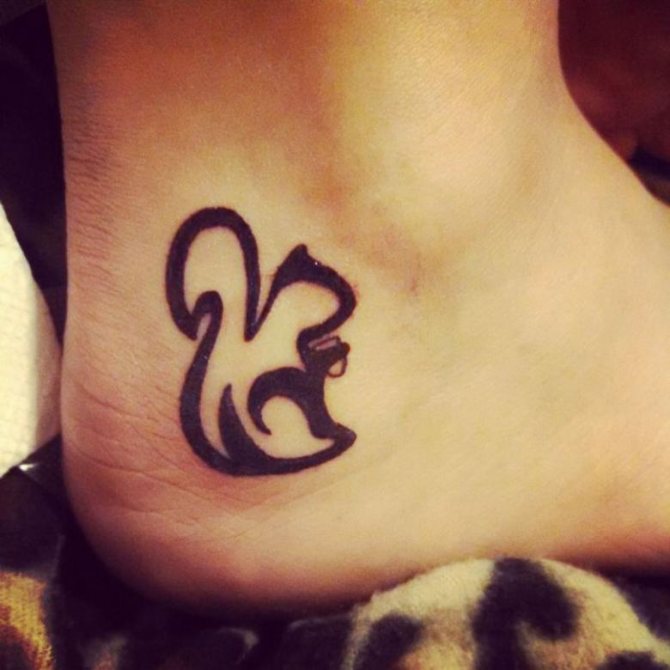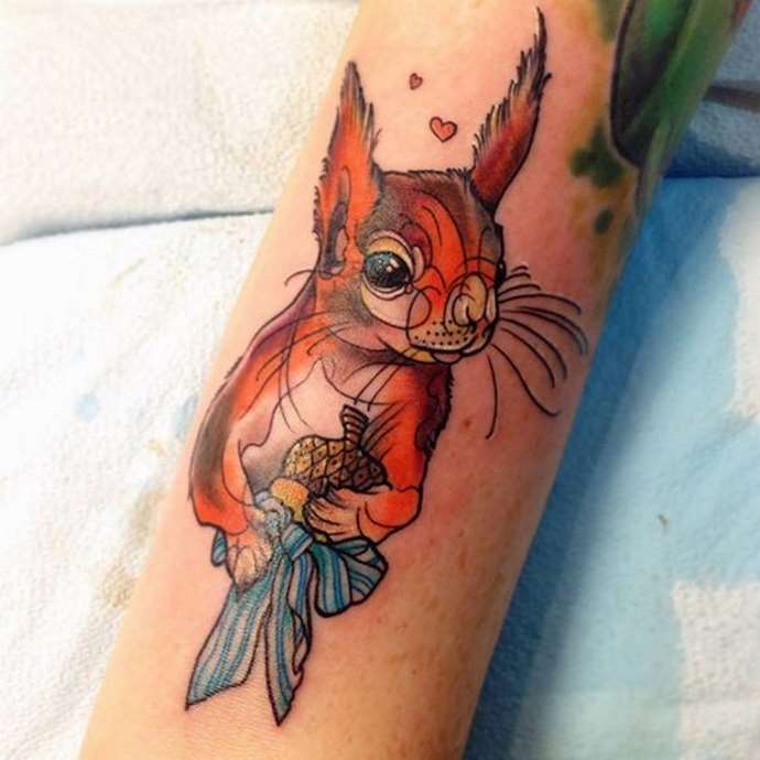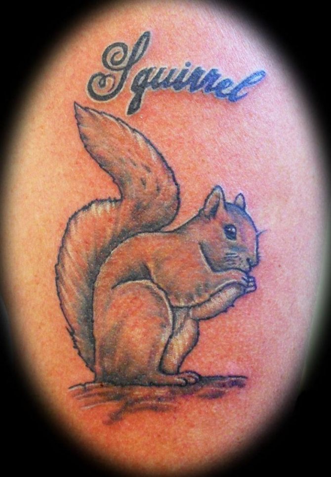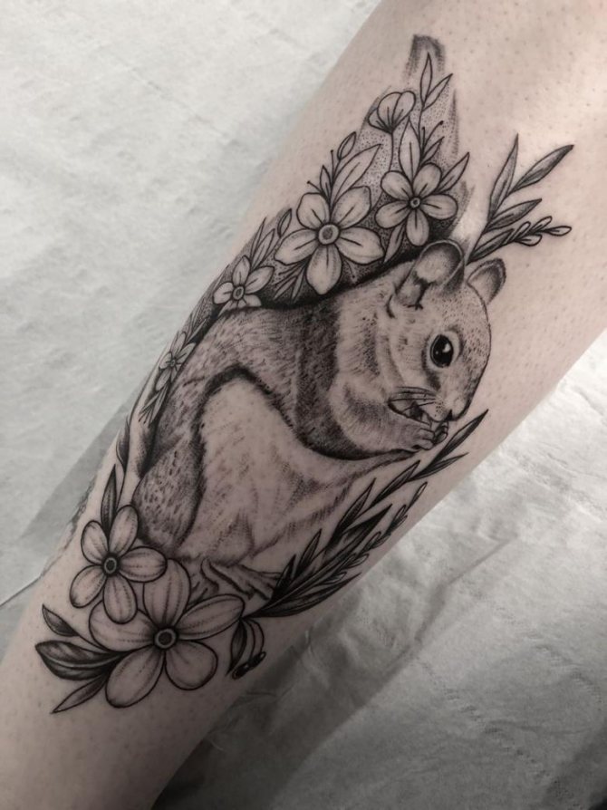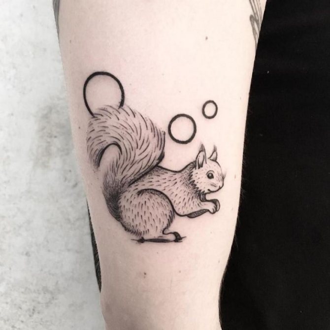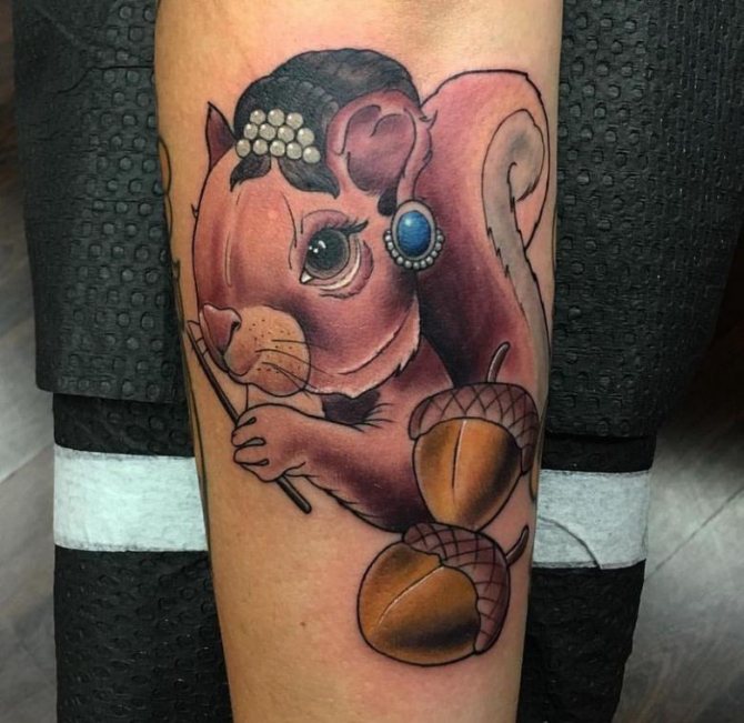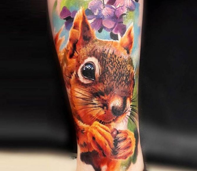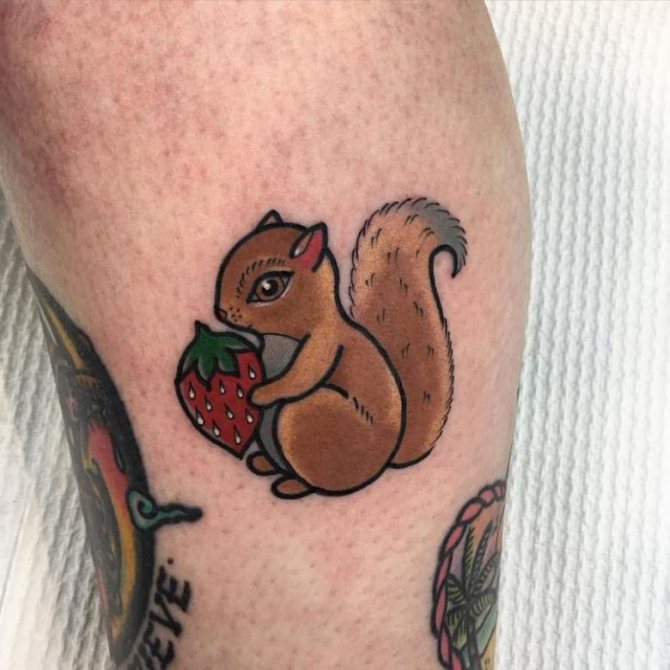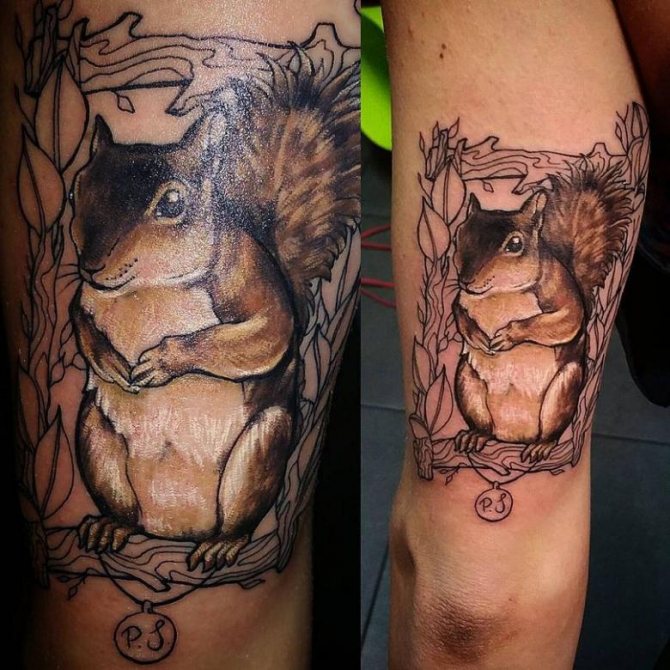 En outre, l'écureuil est identifié à la cupidité, l'égoïsme, la clairvoyance, la capacité à s'adapter à toute situation. Le propriétaire d'un tel tatouage obtient un optimisme supplémentaire et une apparence fraîche. À côté, un mot supplémentaire peut être imprimé, par exemple : J'aime les écureuils, vivre comme un écureuil dans une roue ou autre chose au choix du porteur de l'image. Les artisans peuvent facilement créer une combinaison avec du noyer, des feuilles, des pierres précieuses.