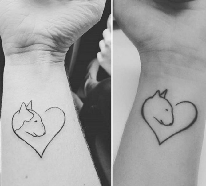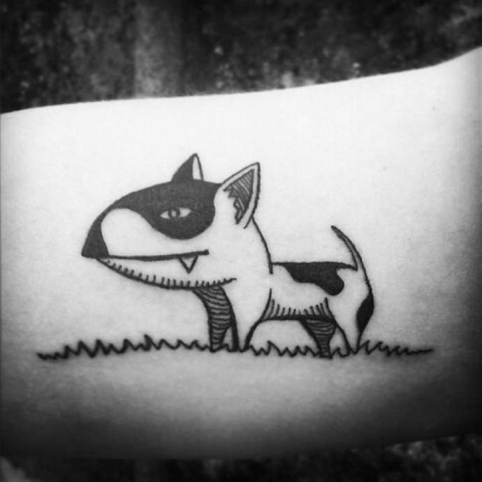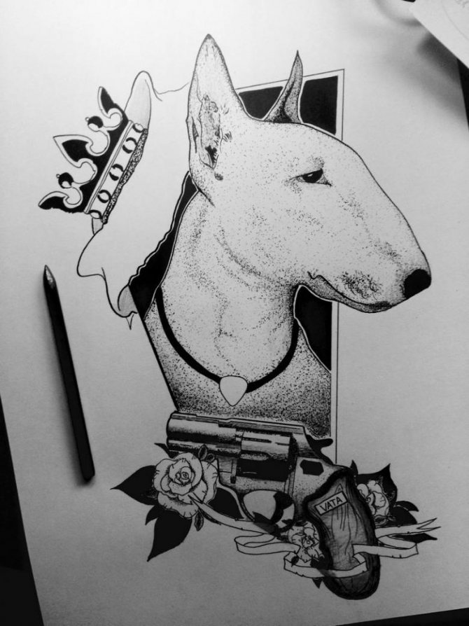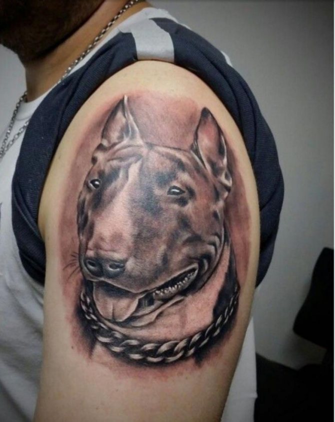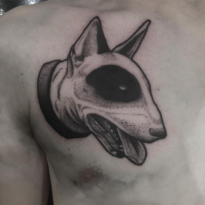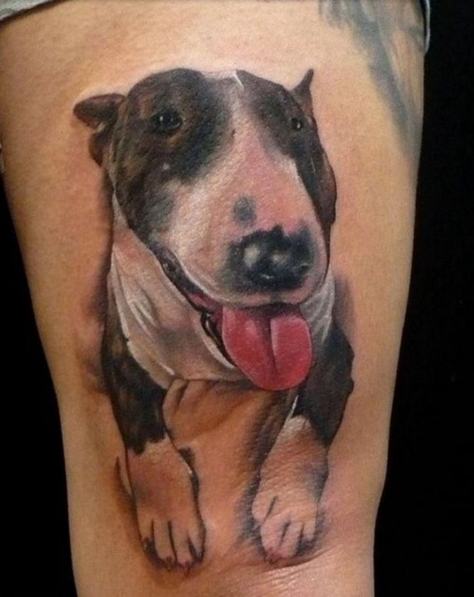 Tatouage de Bull Terrier - Une image qui peut être réalisée dans des styles absolument différents. Certains décorent leur corps d'un dessin semi-blagueur - un chien mignon et bon vivant sur un fond d'os, de papillons, de cœurs, etc. Certaines personnes obtiennent ces tatouages en signe de grande affection pour leur propre chien, comme mentionné ci-dessus. Ces images peuvent être accompagnées de diverses inscriptions. Les tatouages peuvent ne pas avoir de signification particulière.