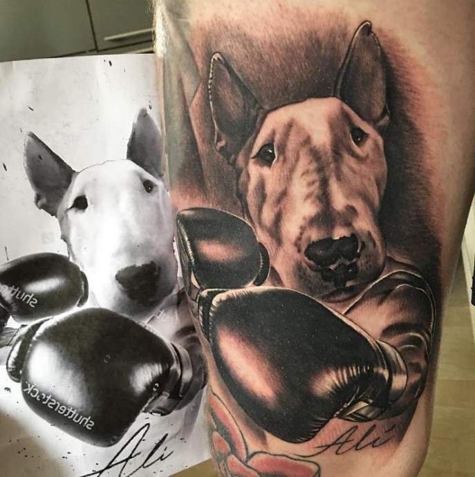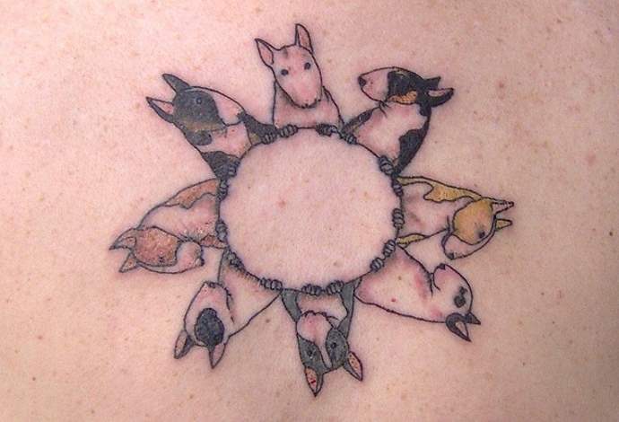 La popularité des dessins représentant des chiens augmente de jour en jour, ainsi que celle des autres animaux en général. Le tatouage du bull terrier en est la preuve. Le pays d'origine de cette race gracieuse est l'Angleterre, aussi les dessins sont-ils plus courants sur le continent européen.