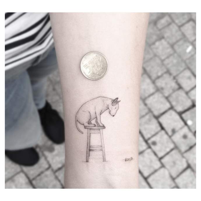 Les esquisses de tatouage, réalisées dans le style des dessins animés, des graphiques et des contours, peuvent être petites, de 1,5 à 7 cm. Les "portraits" réalistes de bull terrier sont souvent de taille moyenne, mesurant entre 8 et 15 cm.