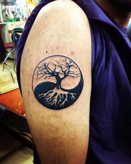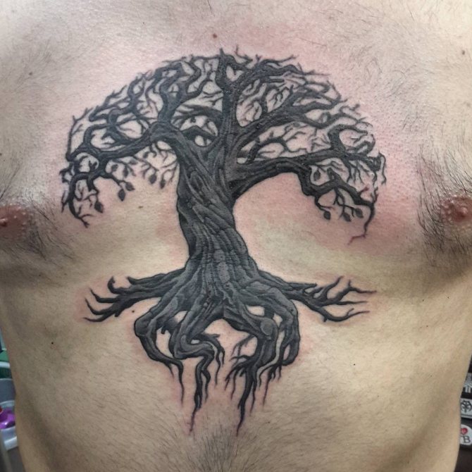L'arbre symbolise constance, détermination. Avec ce tatouage, les hommes montrent leur propre force, leur confiance et leur fiabilité. Ce tatouage indique que l'homme est capable de relever des défis. Un homme est un pilier pour ses proches.