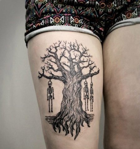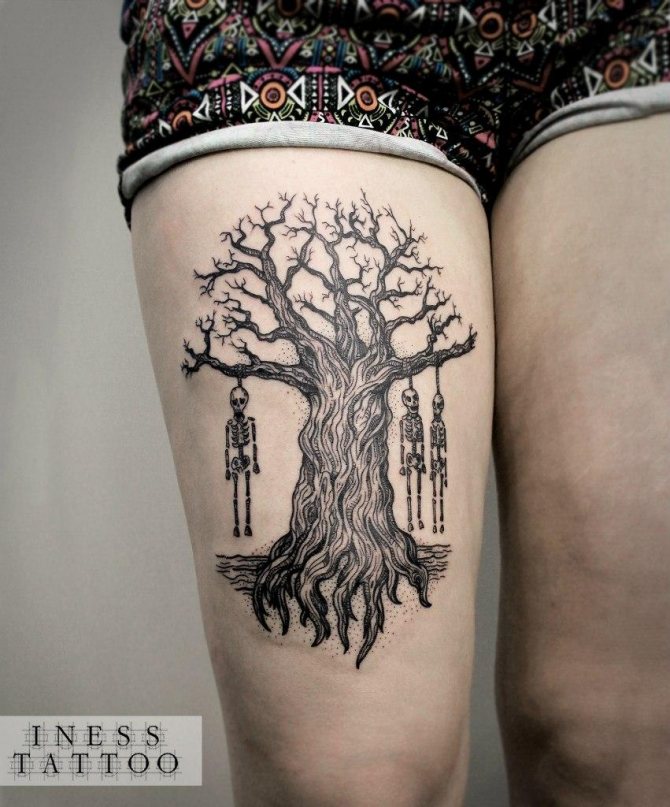 - Dessin avec des squelettes. Ce type de tatouage convient aux filles audacieuses et aux amoureux de l'esthétique sombre. L'image de l'arbre du monde dans ce cas, complétée par des figures de squelettes. Le tatouage peut rappeler à son porteur le caractère éphémère de la vie ou simplement traduire son amour des histoires sombres.
