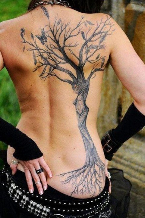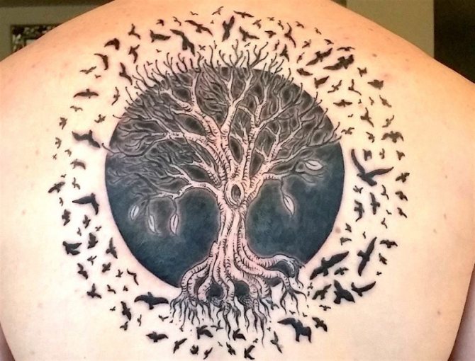 Une combinaison d'un arbre et d'oiseaux ou d'animaux, de soleil et de rayons, de racines et de divers éléments comme des crânes, des os ou des cœurs. Un tel tatouage créera une image complète sur le corps.