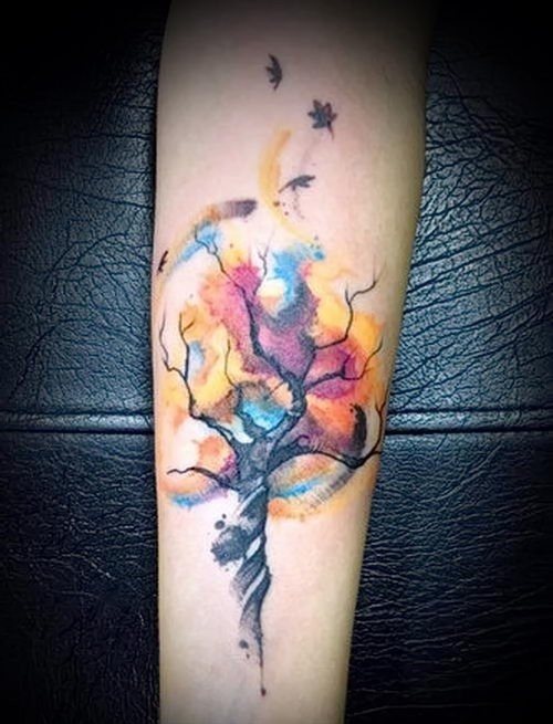 Un autre style dans lequel un tatouage d'arbre serait cool est l'aquarelle. Alors qu'une image graphique est suffisamment nette et précise, les œuvres à l'aquarelle sont délicates et aérées, avec quelques lignes nettes et des couleurs vives qui aident à transmettre l'amour de la vie. La forme et la taille de l'esquisse détermineront l'endroit où le tatouage sera placé. Une manche, par exemple, suggère une image oblongue, les œuvres rondes conviennent mieux au cou et il peut y avoir une scène entière dans le dos.