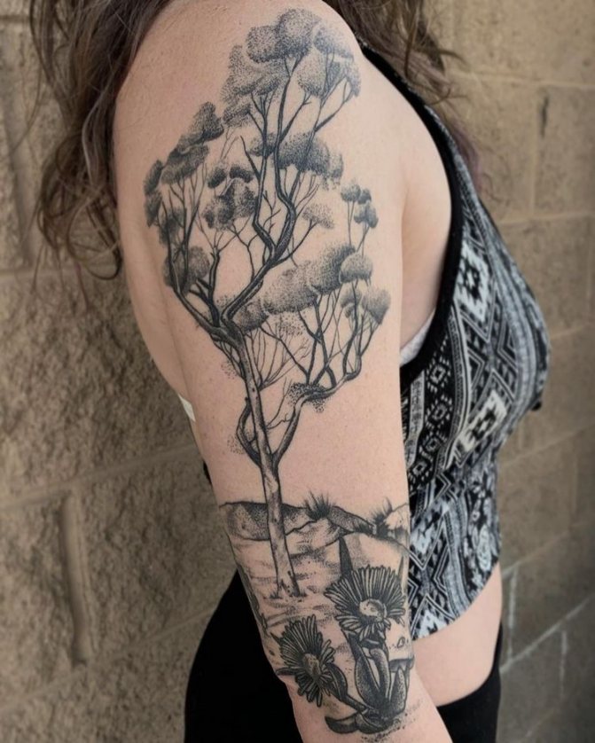 Le tatouage d'un arbre a une signification positive et très profonde : fertilité, connexion avec la nature, développement et croissance, unité du début spirituel avec le physique, immortalité et force. Ce motif représente la vie sous son meilleur jour. Chaque partie de la plante a une signification. Le tronc est un symbole de résilience et de capacité à relever les défis de la vie, tandis que les racines sont responsables de la force et des fondations. Les branches, symbole de la continuité de l'être, et les bourgeons qu'elles portent - nouvelle vie, nouvelles générations. C'est pourquoi la signification du tatouage dépend beaucoup de la façon dont sont représentés les racines, les feuilles, les fruits et l'épaisseur du tronc et des branches.