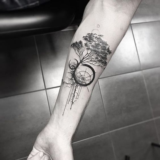 Le style du graphique est plutôt intéressant. De nombreuses personnes pensent à tort que ce style englobe tous les travaux réalisés en noir. Une caractéristique distinctive des graphiques est l'affichage des ombres par l'utilisation de l'ombrage. Les tatouages de ce style se caractérisent par un noir profond et l'absence de toute demi-teinte. On trouve souvent un tatouage d'arbre enfermé dans un triangle, il est spectaculaire sur le mollet ou l'avant-bras.