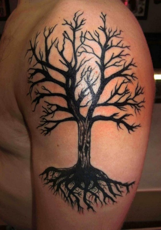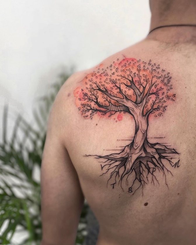 Le tatouage d'un arbre avec des racines a une signification particulière. Les racines étendues sont une association de la masculinité, stable et inébranlable. Un arbre avec des racines semble monumental sur le dos d'un homme large et fort.