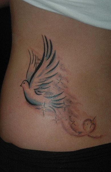 Le tatouage d'une colombe soulignera la tendresse et le charme d'une fille. Pour le beau sexe, l'oiseau est synonyme de féminité et de maternité, de bonheur dans une famille. Une femme tatouée d'une colombe apporte joie et gentillesse dans le monde. Si elle a trouvé l'amour, c'est pour la vie.