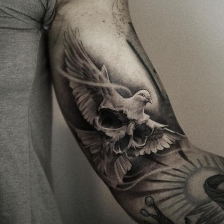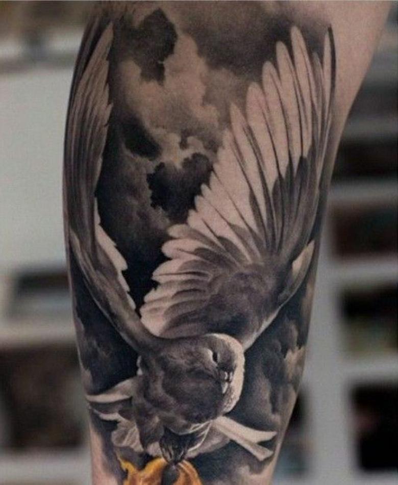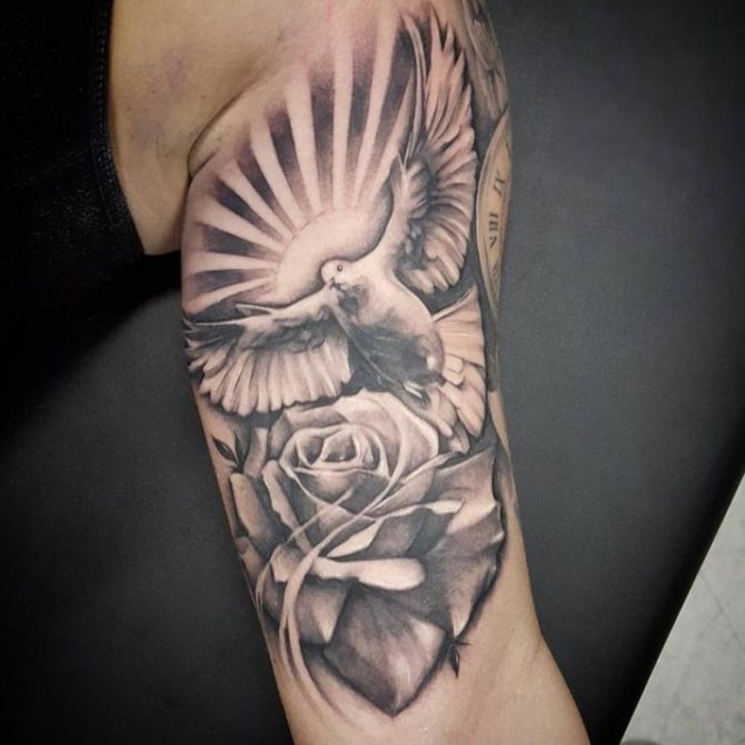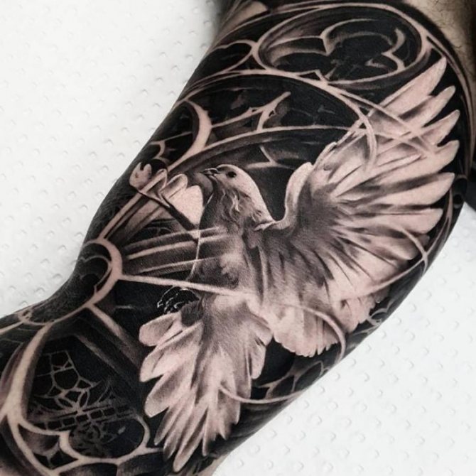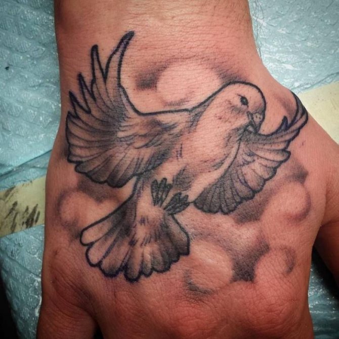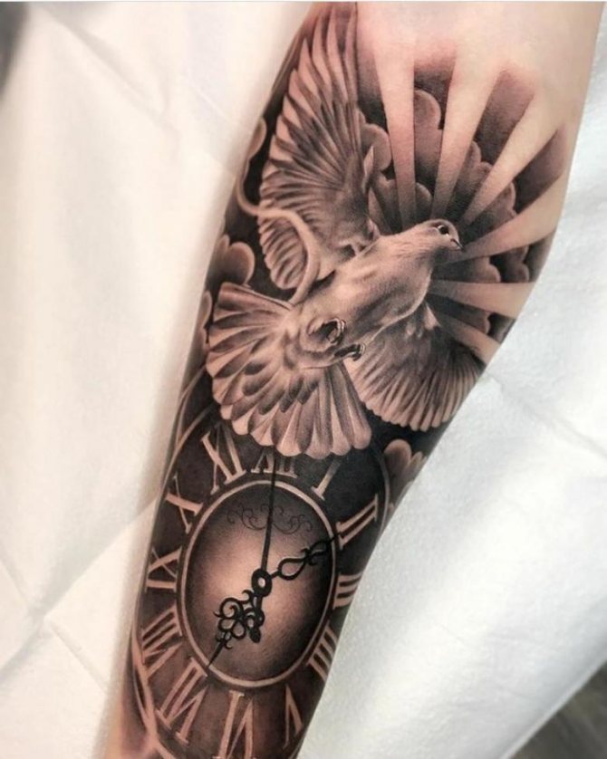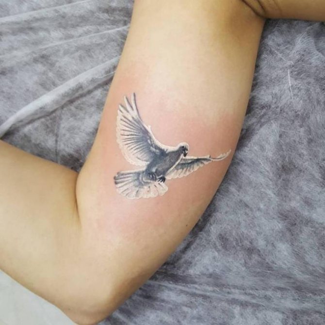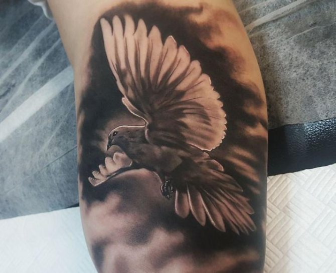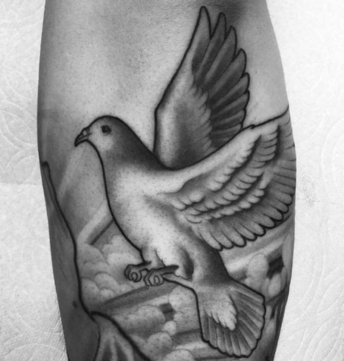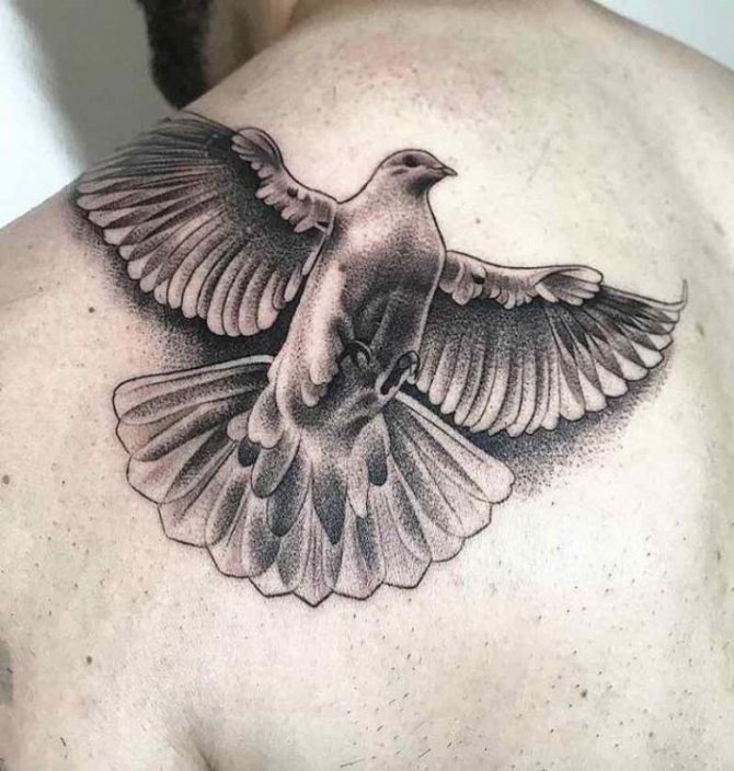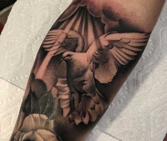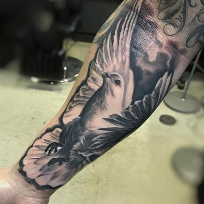L'intérieur de l'avant-bras, qui, soit dit en passant, est considéré comme universel et convient au sexe fort, porte également bien l'image d'une colombe. Chez un homme, un tel oiseau ferait bonne figure sur l'épaule, le tibia ou le mollet. Une option intéressante consiste à le placer dans le dos, entre les omoplates ou sur l'une d'entre elles.