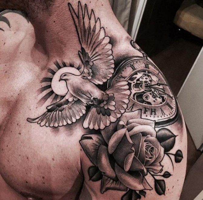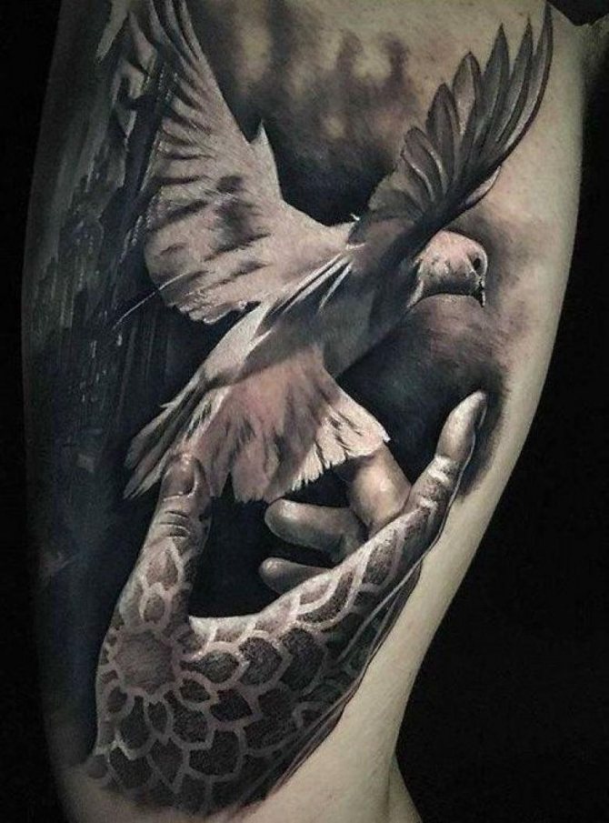 Le tatouage d'une colombe pour les hommes a une interprétation différente. Le dessin signifie que le gars se bat jusqu'au bout et n'abandonne jamais, grâce à sa force intérieure. Les difficultés l'endurcissent. Il est honnête, juste et ouvert d'esprit. Il ne sera pas le premier à être confronté. Dans l'image de l'oiseau, les hommes voient aussi la renaissance. Après être tombé après une défaite, il faut se relever et se battre.