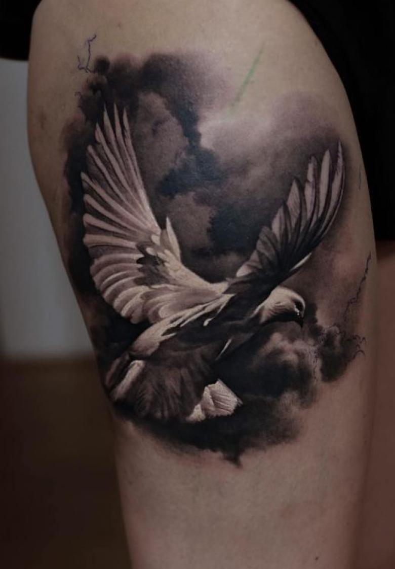 Les exemples de tatouages de pigeons spectaculaires abondent. Souvent, les femmes et les hommes donnent la préférence à une image de l'oiseau aussi proche de la réalité que possible. Ce caractère naturel est d'une beauté hypnotique.