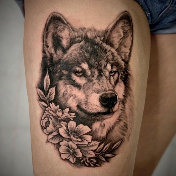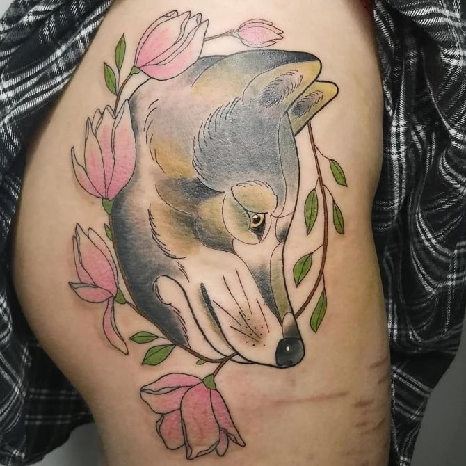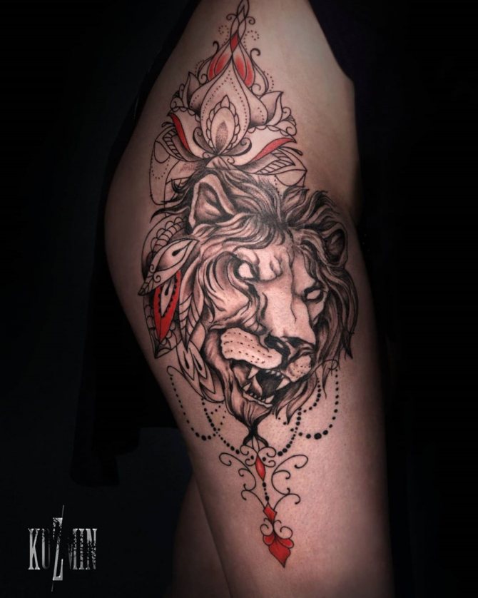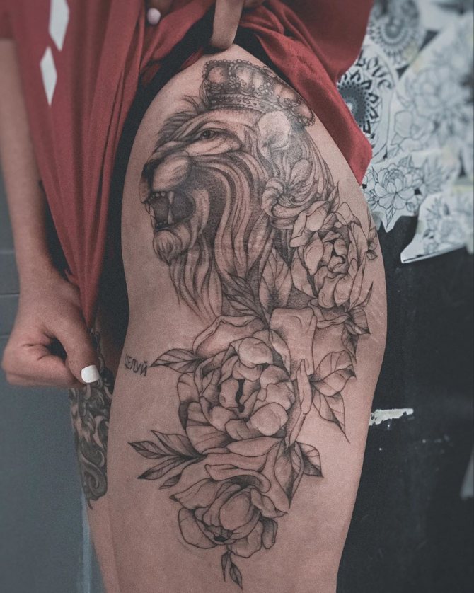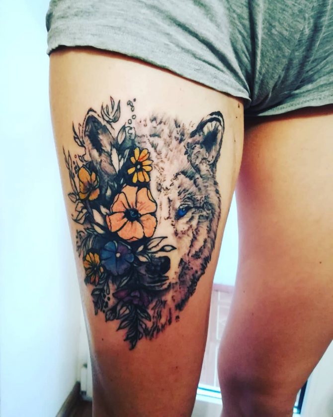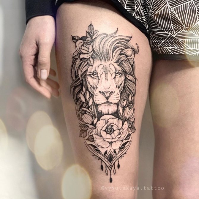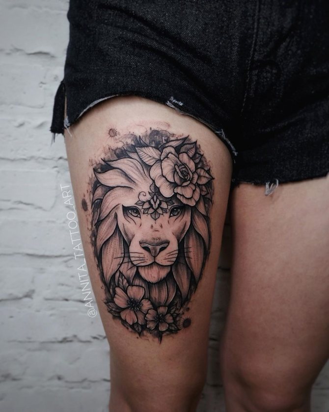Les femmes se font souvent tatouer un prédateur avec des fleurs. Cette image est élégante et majestueuse. Il est le plus souvent appliqué sur la cuisse.