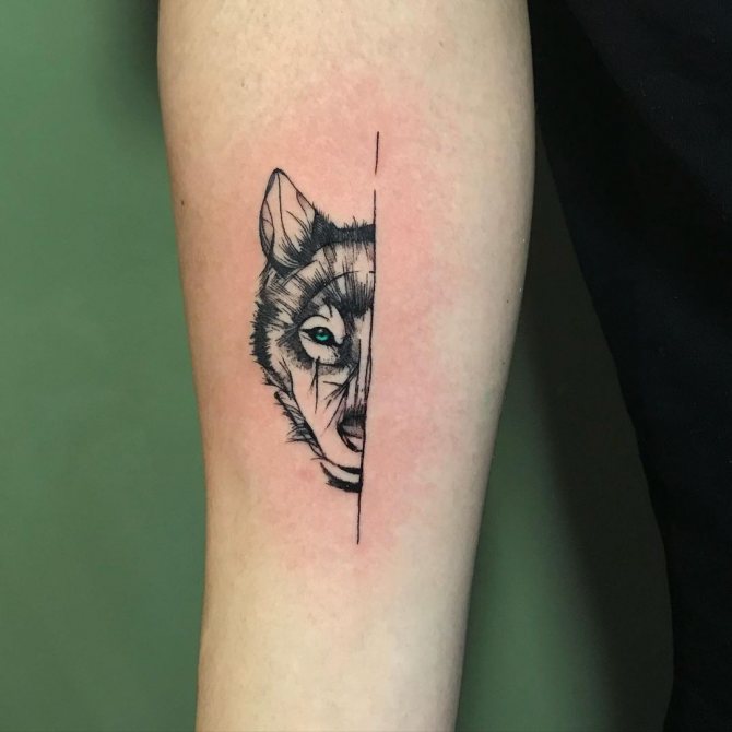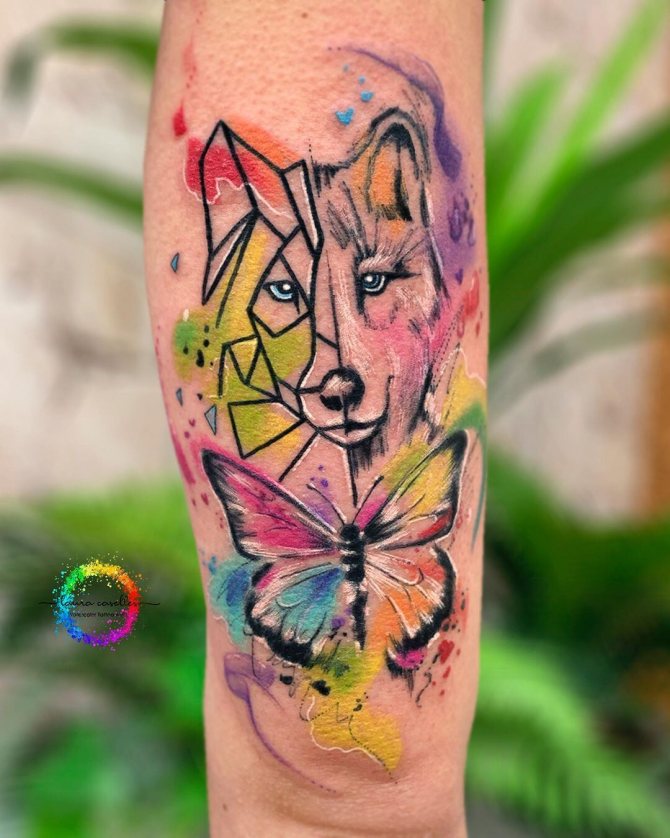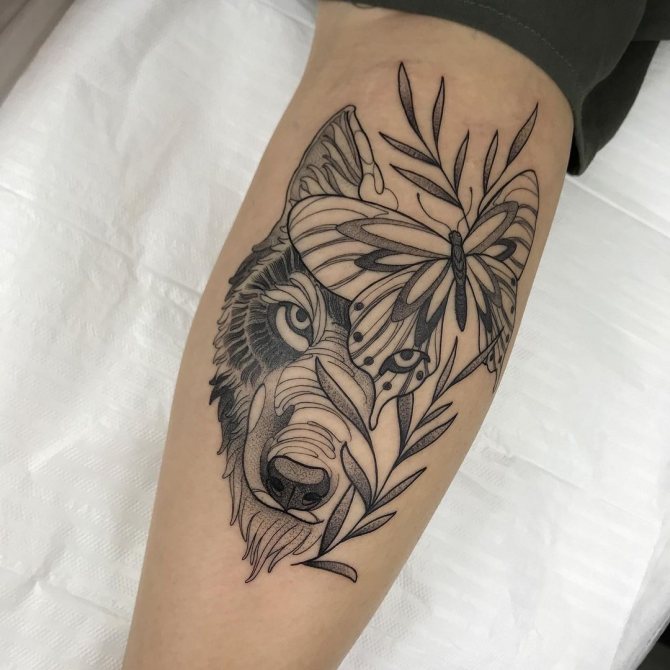 Un dessin simple d'un loup sur un fond de papillons est choisi lorsqu'on souhaite souligner une nature romantique qui n'a pas tendance à abandonner face à l'échec. Seule une personne au cœur solide peut combiner la dynamique d'un loup avec l'abstraction d'un papillon. En général, un petit tatouage est inscrit sur l'avant-bras, où il peut être vu par le porteur et par les autres.