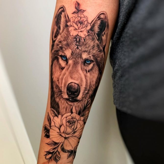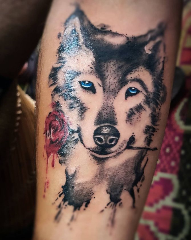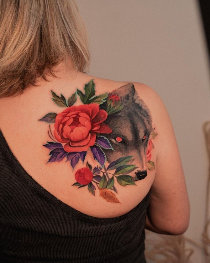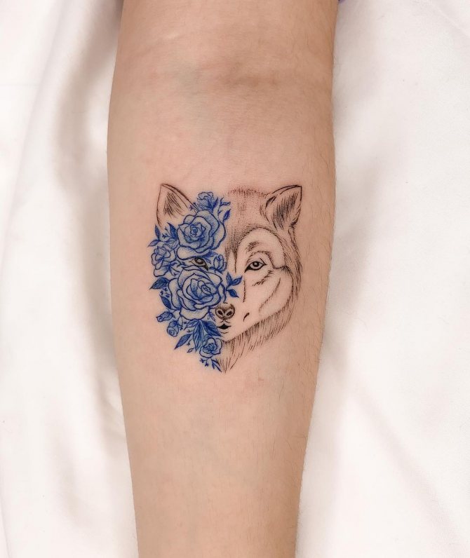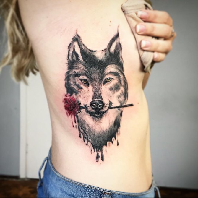 Le loup avec une rose entre les dents représente une nature dure et déterminée d'un côté, et une nature romantique et loyale de l'autre. Elle est appliquée par les hommes et les femmes sur les zones délicates de la peau, comme pour souligner qu'ils sont prêts à endurer la douleur au nom de l'amour et de la beauté.