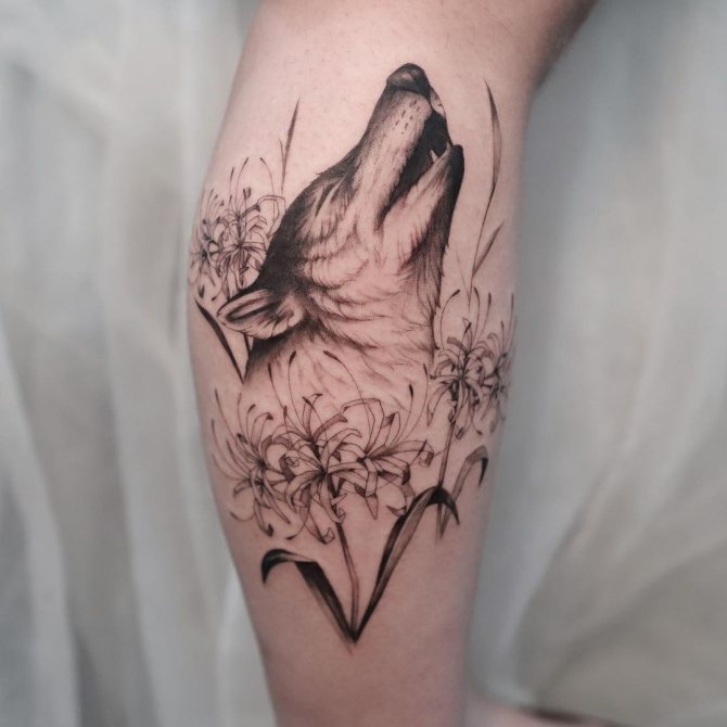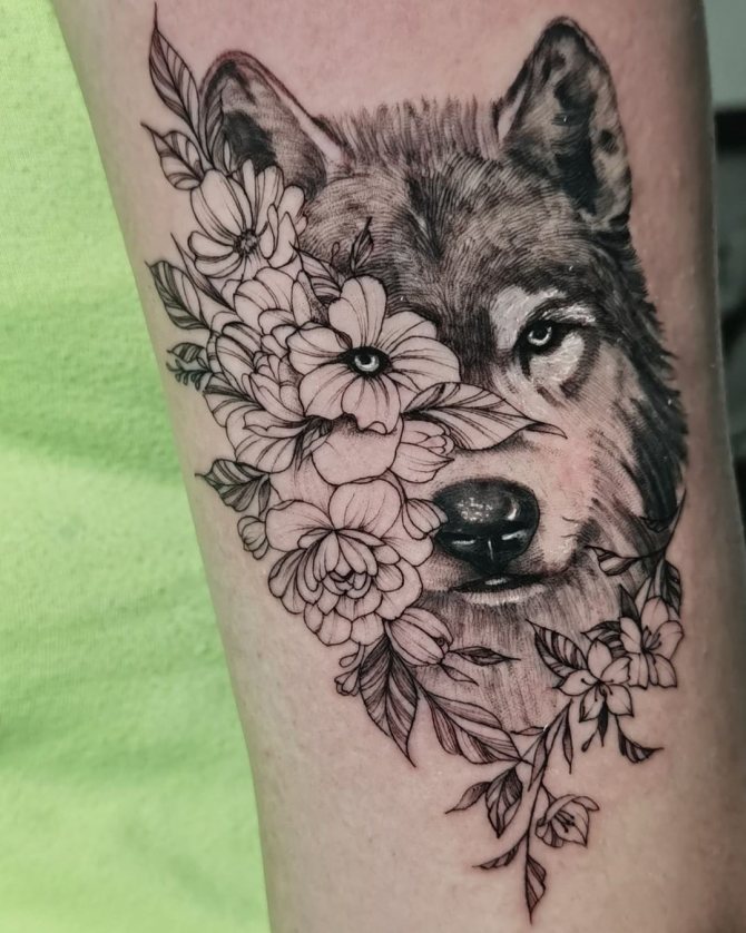 Une autre version romantique du loup, entrelacée de motifs floraux. C'est comme si l'artiste voulait souligner qu'un être humain est puissant, courageux et doux en même temps qu'il est prêt à aimer et à donner. Le tatouage sur sa jambe fait allusion à un loup sortant d'un fourré fleuri.