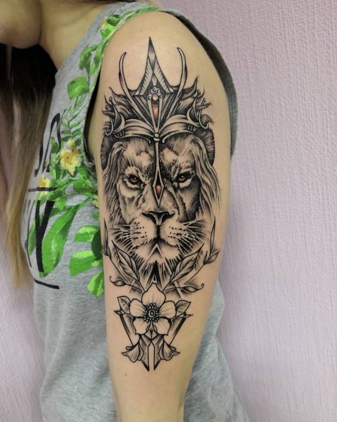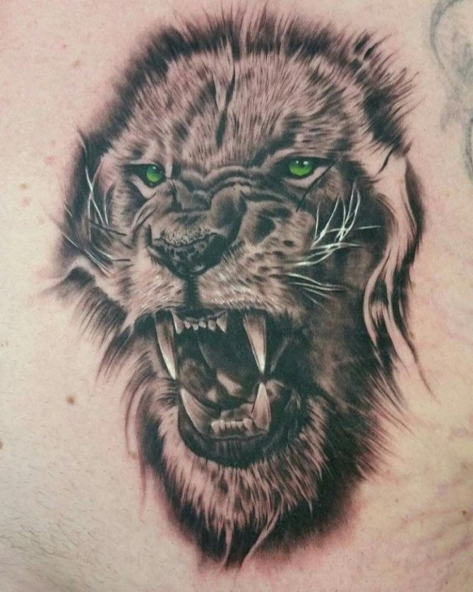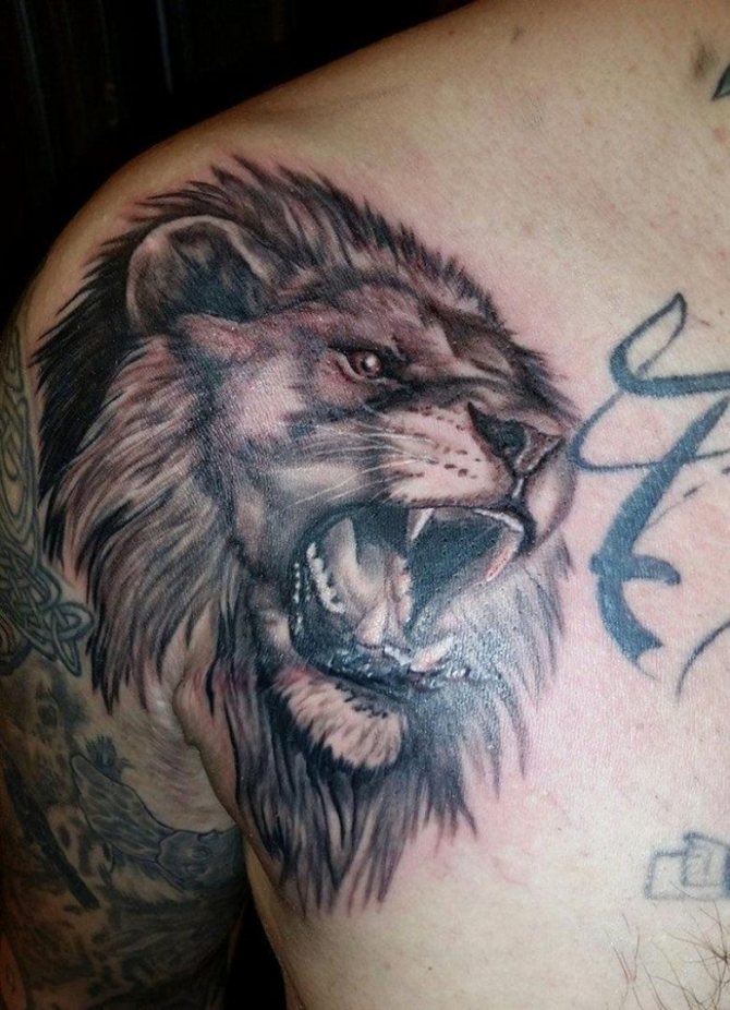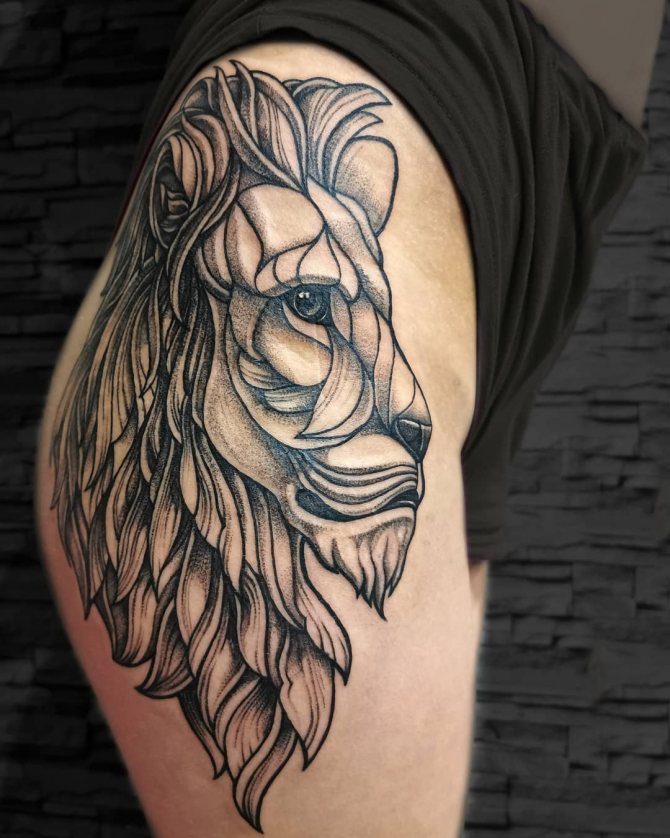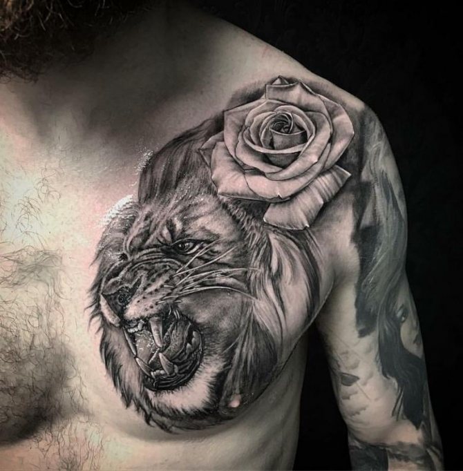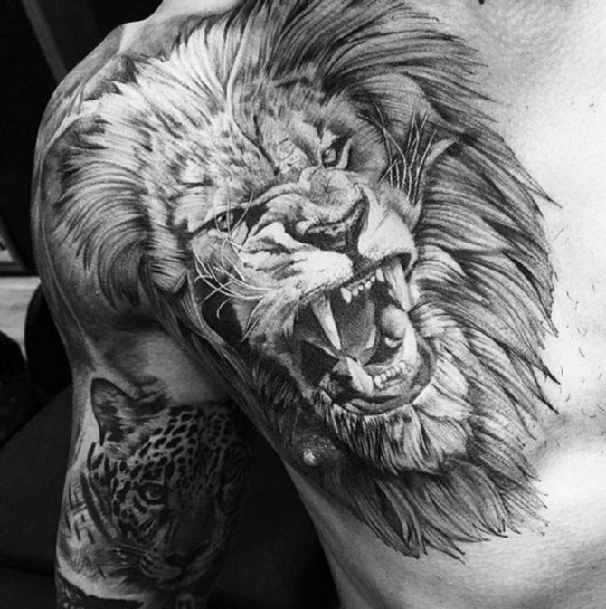 Un tatouage sur l'épaule est une caractéristique d'un leader confiant. Quel que soit l'endroit où le motif est exécuté, il signifiera toujours la croyance en soi et la liberté d'esprit. Si un lion et un livre sont combinés dans l'image, nous avons devant nous une personne plutôt sage. La gueule du lion sur la poitrine est interprétée dans le symbolisme carcéral comme le pouvoir inconditionnel de l'autorité.