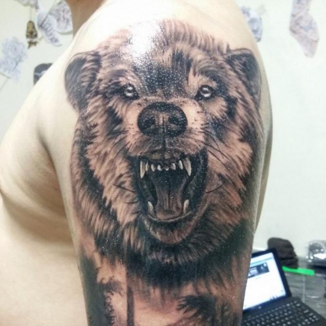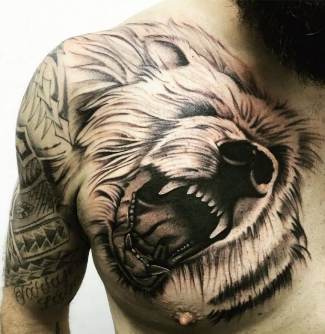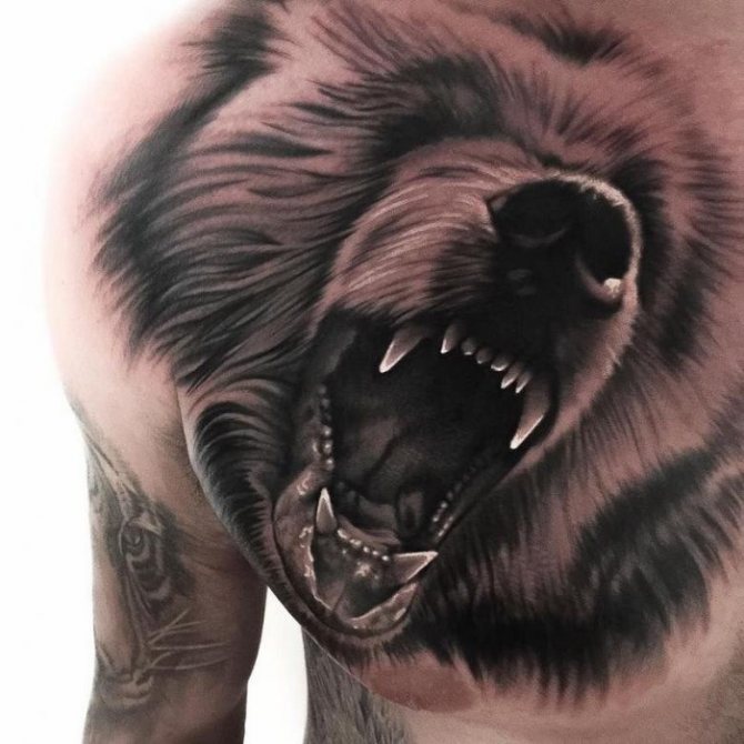 Si vous voulez vaincre n'importe quel adversaire au combat, souligner votre puissance brute et effrayer l'ennemi, un tatouage avec une bête grimaçante est le bon choix pour vous. Montrer les dents avec un grognement implicite représente une force de caractère caractéristique. Les hommes qui ont de fortes qualités de caractère, ou qui veulent les acquérir, préfèrent être empalés sur son torse est un ours souriant.