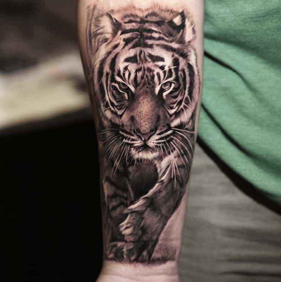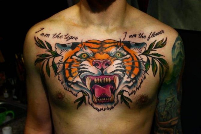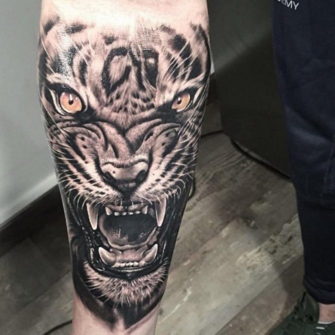 - Tibia, mollet, manche, dos, poitrine. Il est possible d'y placer un grand tatouage qui représente l'animal dans son intégralité. Les détails, les ombres, la géométrie complexe, etc. sont les bienvenus. Si vous le souhaitez, des couleurs vives sont ajoutées. Un tigre courant vers le haut peut être représenté sur la jambe.