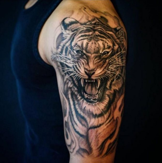 3Sur l'épaule. Cet endroit démontre la masculinité. D'un point de vue esthétique, les tatouages sont beaux sur l'épaule avec des muscles proéminents. Les tatouages classiques sont réalisés avec une tête de tigre ;