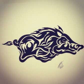 Un tatouage avec un sanglier est rarement vu chez les filles car il exprime une masculinité distincte, la prédominance des traits masculins dans le caractère et l'apparence. Un design vintage ou ethnique, avec des ornements originaux, est une option intéressante. Le tatouage peut servir d'amulette qui apporte énergie, bonne santé et vitalité.