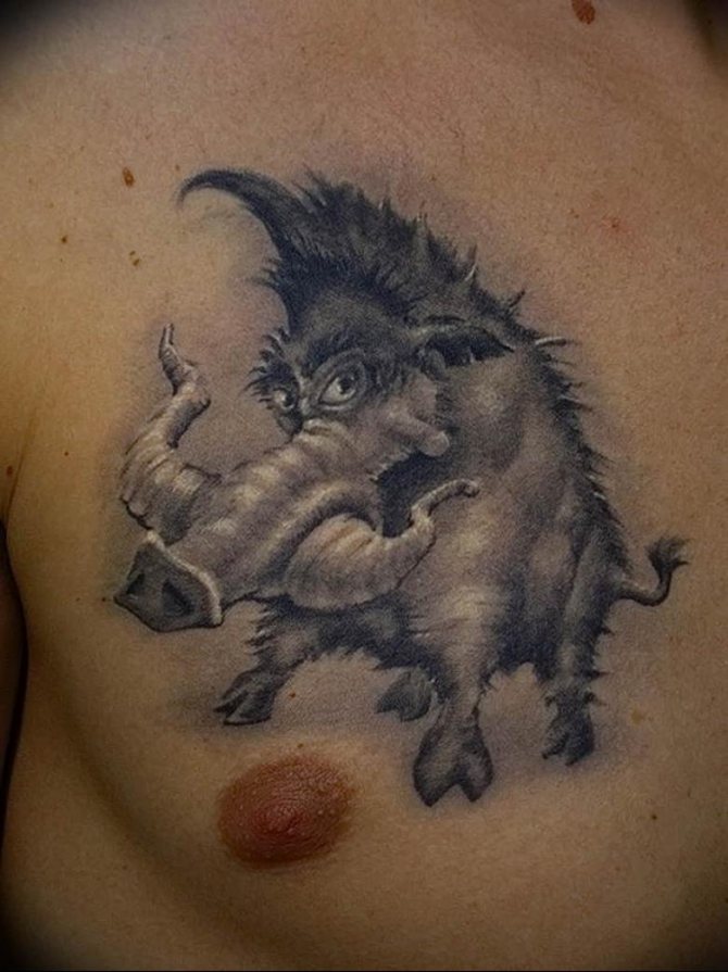 Les filles ornent souvent leur corps de tatouages représentant des sangliers, personnages de films d'animation. L'image des personnages de dessins animés provoque une humeur positive chez les autres, et le propriétaire est chargé d'optimisme et de bonne humeur en regardant le tatouage. Très populaire parmi les artistes, le tatouage du héros du dessin animé Disney "Le Roi Lion", le phacochère sanglier Pumba, est joyeux et simple d'esprit.