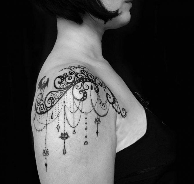 Moins souvent - sur la poitrine et le dos. De même, la dentelle peut ne pas être une image séparée, et être représentée dans la composition avec d'autres éléments du tatouage.