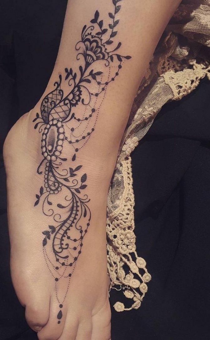 En général, les tatouages dans le style de la dentelle sont appliqués sur les poignets, les jambes, les chevilles. Moins souvent - sur le cou, la poitrine et le dos. Dans le premier cas, le tatouage représente une jarretière en dentelle, un ruban, une gaine autour du poignet, du tibia, de la cheville. Dans le cas où l'image occupe une grande surface, elle et transférée aux épaules, aux cuisses.
