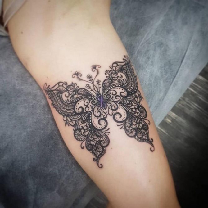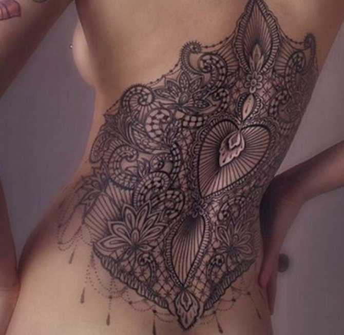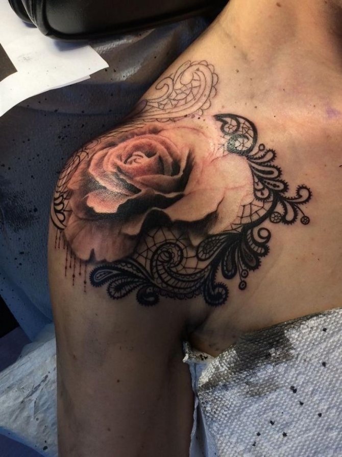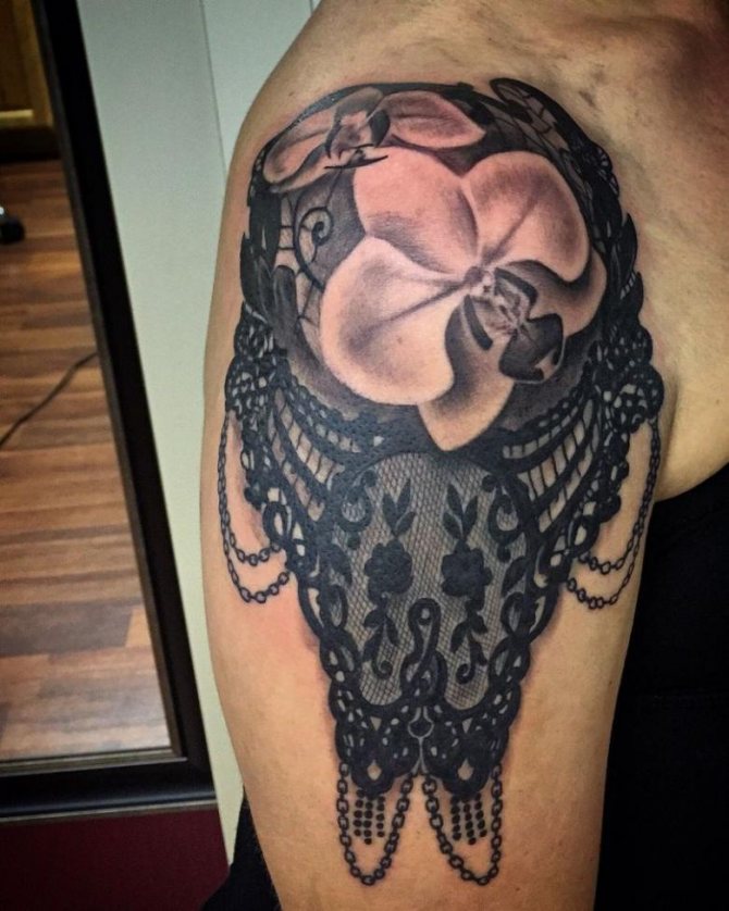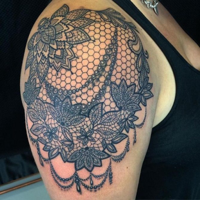Les filles aiment les motifs délicats et accrocheurs, surtout sur leur corps. La dentelle de tatouage fait simplement référence à de telles images. Il peut servir de décoration à l'image déjà créée et faire partie du monde intérieur. Pour les hommes ou sur le corps d'une femme, c'est un tatouage très attrayant.