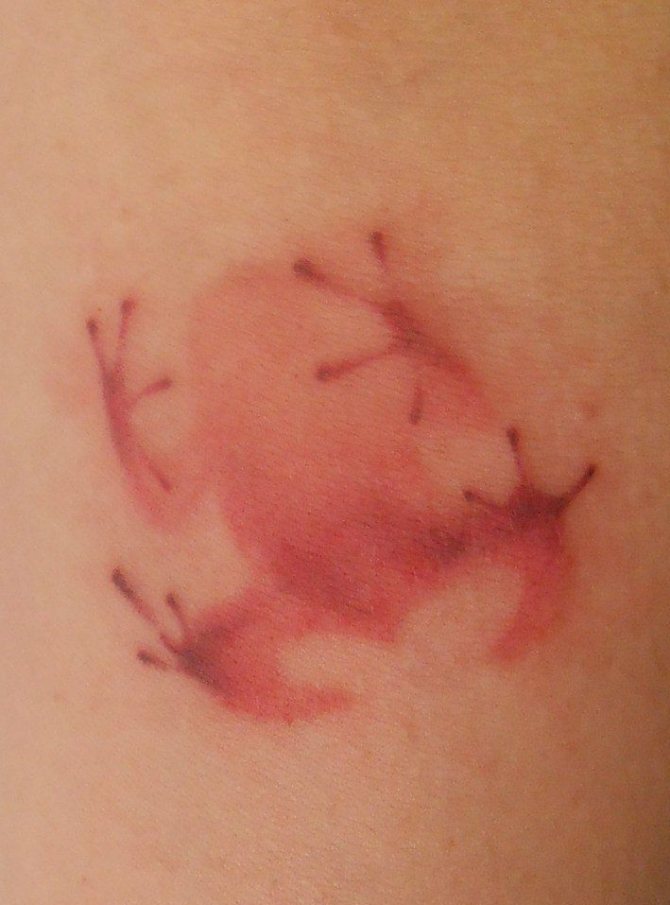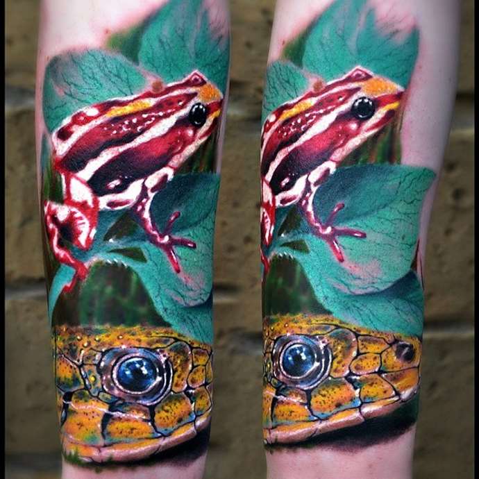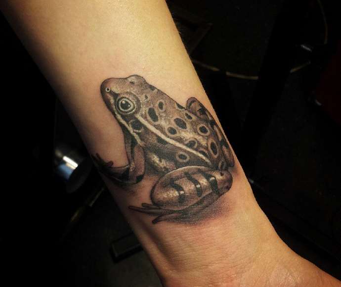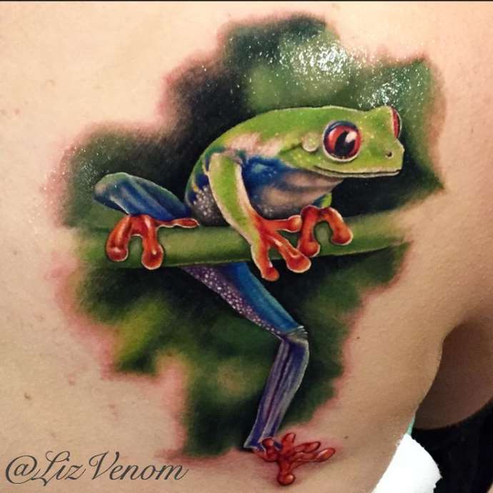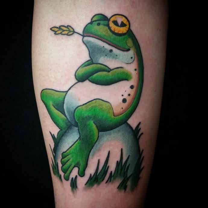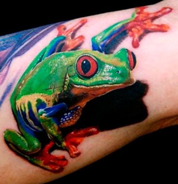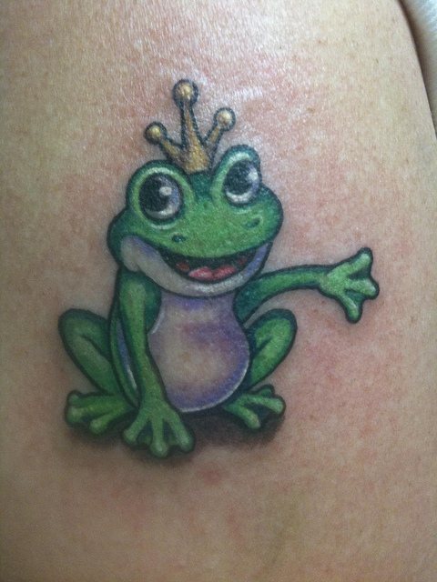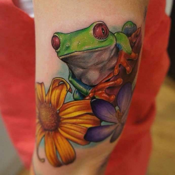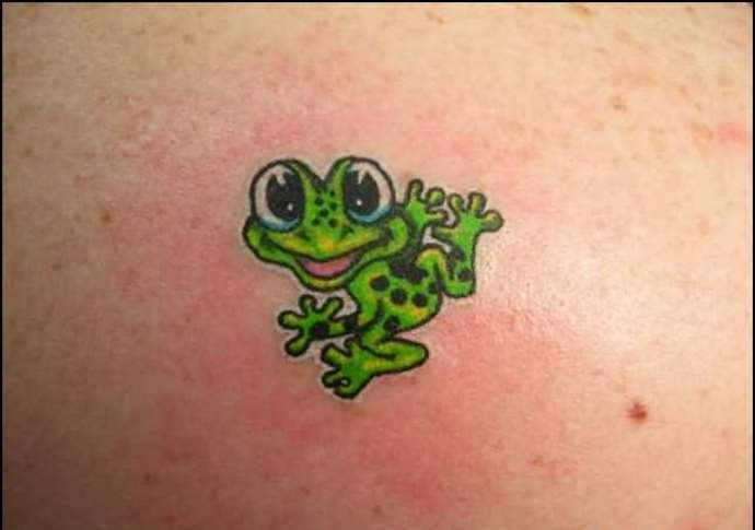 Pour un tatouage amusant de dessin animé avec un costume de grenouille style new skool (voir les photos dans la galerie). L'image saturée et lumineuse est tridimensionnelle et convexe. La composition peut être enrichie de détails et d'une intrigue clairement visible. Par exemple, une grenouille assise sur une feuille avec une couronne sur la tête. À cette image, il conviendrait d'ajouter une flèche qui se trouve à côté ou que l'héroïne tient dans les griffes d'un personnage de conte de fées. Pour le croquis, choisissez une photo de petite taille et de forme arrondie. Pour le lieu d'application conviendra le bras, l'épaule, l'omoplate, le ventre.