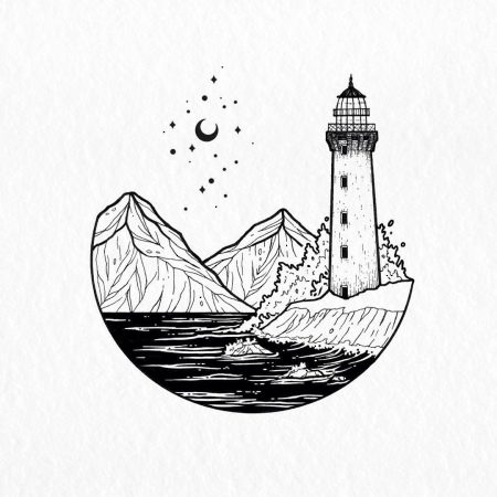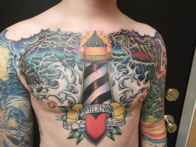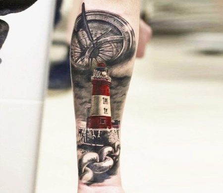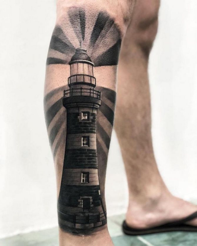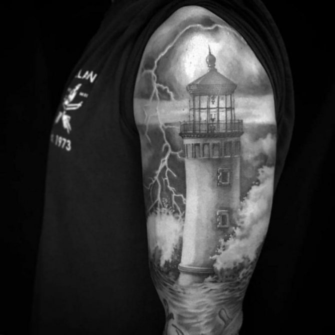Placez les images de phare de tatouage sur les bras, les épaules, les avant-bras, le dos, et si le croquis est oblong, alors sélectionnez le tibia. Très belle apparence du tatouage de phare sur l'omoplate.