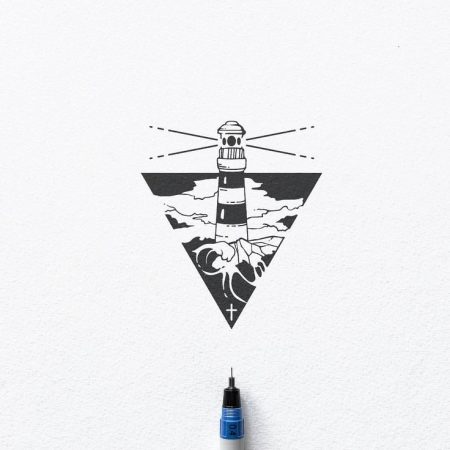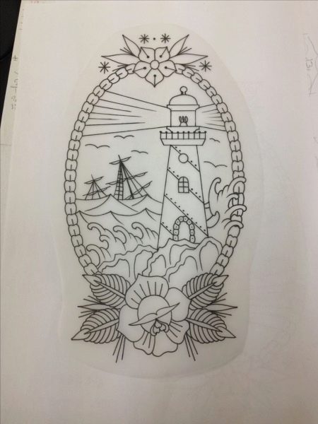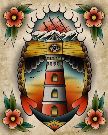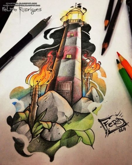- Voici un excellent exemple d'une nouvelle esquisse de tatouage de phare dans le style new skool. Couleurs vives, composition alignée, pas d'espaces vides.