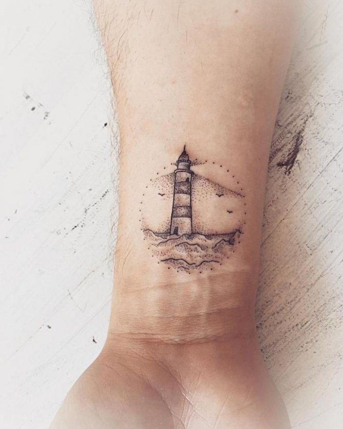 Les filles préfèrent les couleurs plus claires et plus gaies. Tout dépend de la taille du tatouage de phare, car dans un petit croquis, il est difficile de transmettre un grand ensemble de teintes. Il n'est pas rare que ces photos soient remplies par des filles qui ont vécu ou sont nées près de la mer. Et en général, c'est l'espoir d'une solution et l'image d'un avenir radieux.