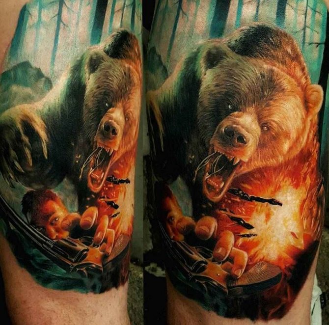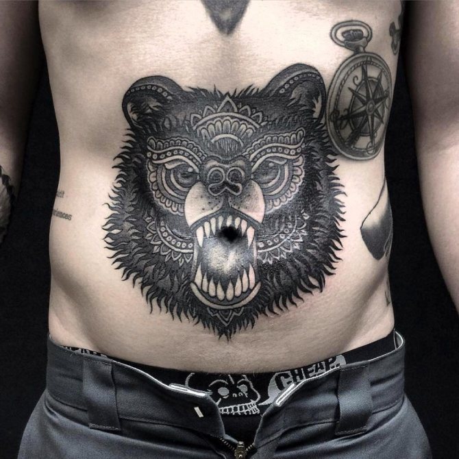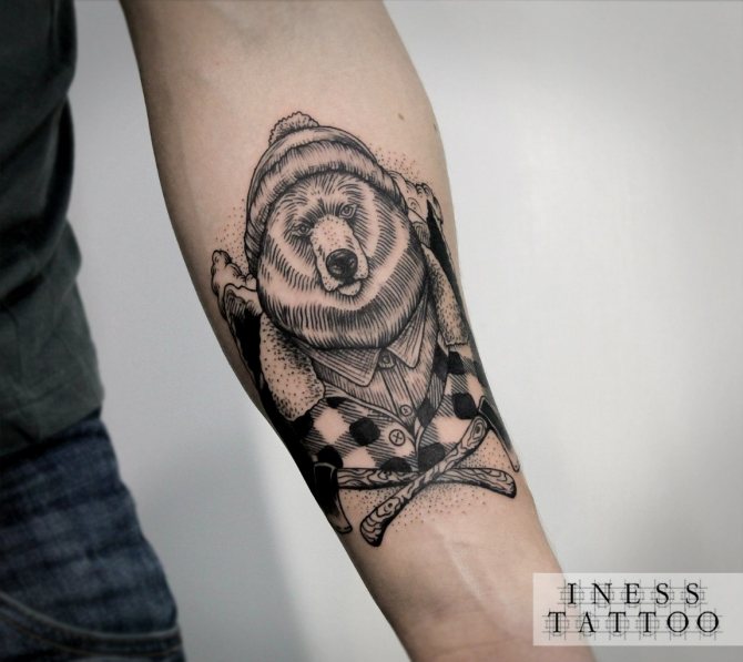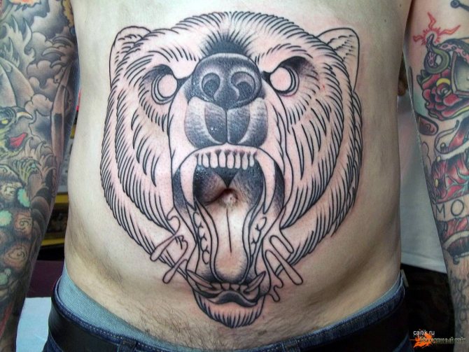 7 Le tatouage de l'ours russe est appliqué afin d'avoir du succès dans les affaires de chasse. Ce n'est pas pour rien qu'il est considéré comme le saint patron de tous les chasseurs. On croit que cette image donne du courage et promet de la chance dans les bois. Ce n'est pas pour rien que l'ours est un symbole national de la Fédération de Russie. Il est à noter qu'après les Jeux olympiques, qui ont eu lieu dans les années 80, de nombreux athlètes ont commencé à appliquer sur le corps des dessins animés image bear. Exactement celui qui est devenu un symbole des événements sportifs.