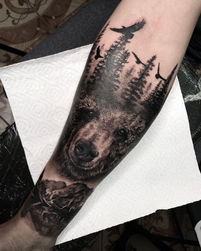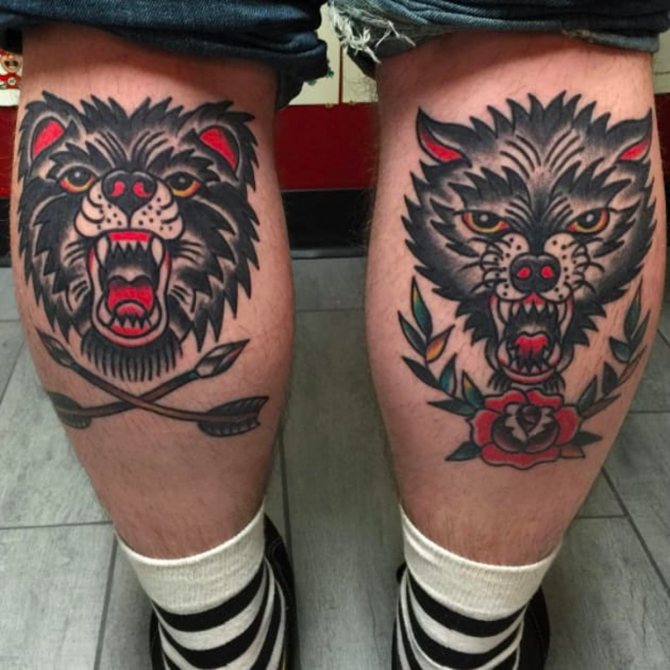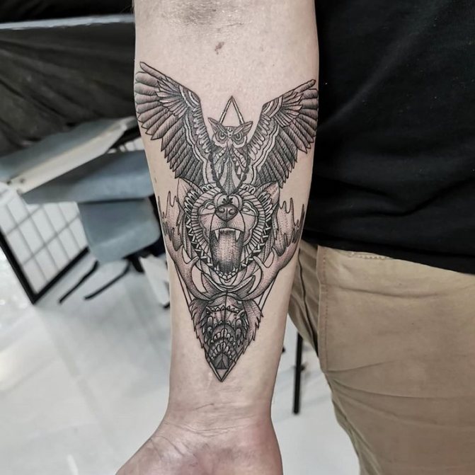 Les tatouages avec les totems indiens, pour lesquels le client choisit, en plus de l'ours, deux autres représentants du monde animal, sont également d'actualité. Le plus souvent, il s'agit d'un hibou sage ou d'un loup. Leurs têtes sont placées l'une sur l'autre. L'oiseau aux ailes déployées est placé en haut.