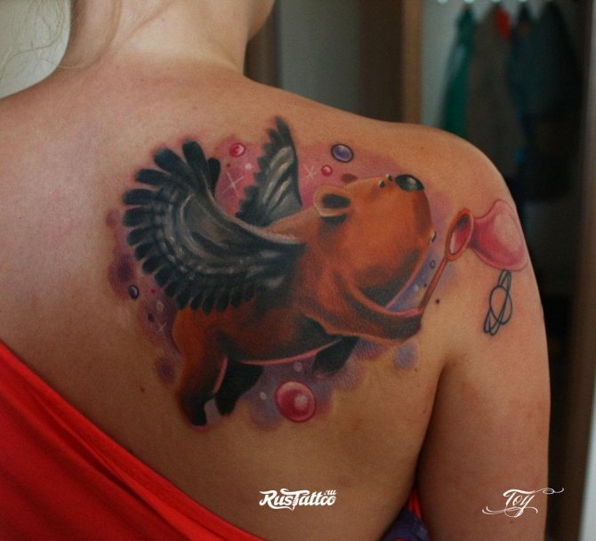 - Les ours des dessins animés et des contes de fées - Winnie l'ourson de Milne, Teddy l'ourson, le célèbre combattant de Kung Fu, Baloo de Kipling et d'autres images d'enfants - ne peuvent être synonymes d'agression. Il s'agit plutôt du héros préféré de l'enfance du porteur du tatouage. Ces options sont souvent choisies par les filles, ce qui indique leur spontanéité, leur humour et leur amour de la vie.