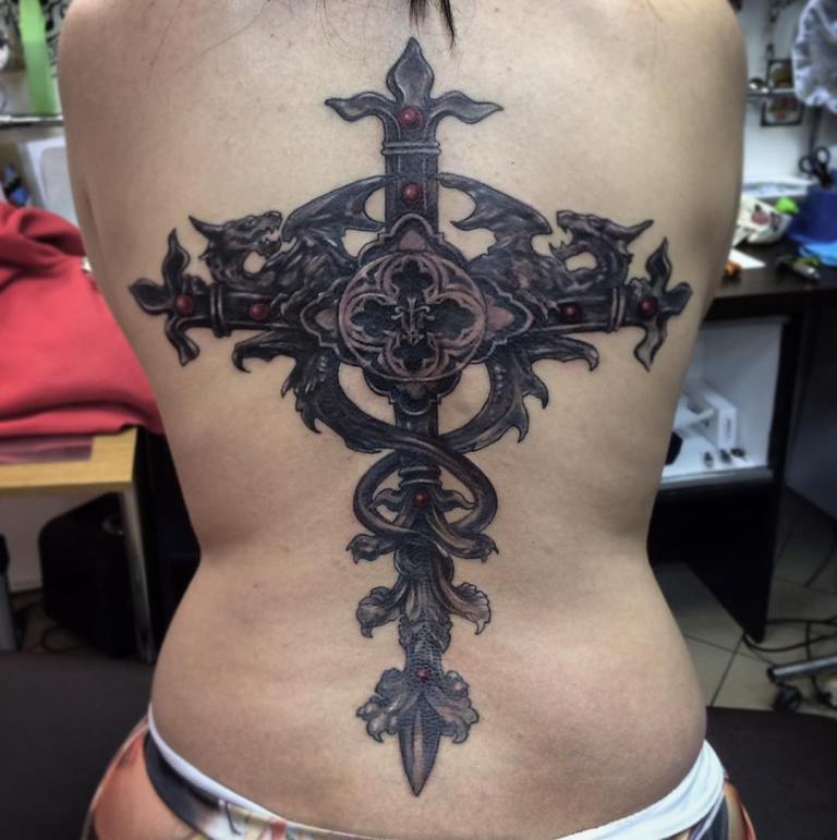 Gothique - a une interprétation totalement non religieuse. Généralement, ce motif implique un symbole représenté en tandem avec du fil barbelé, des serpents, des roses, des épines, des chauves-souris, du sang et d'autres images sombres, ce qui conduit à l'idée d'obscurité et de mysticisme. Les personnes qui apprécient la sous-culture gothique choisissent ce style pour leurs tatouages, en y inscrivant des significations chargées de fortes émotions négatives.