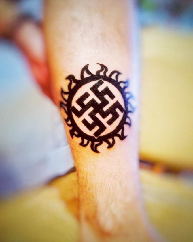 | La roue du soleil Difficile à distinguer des autres symboles slaves et indiens en apparence, il est similaire au Kolovrat et à la roue de Sansarim, et fait référence aux symboles du solarium. Un tel tatouage était réalisé pour obtenir le bonheur, la prospérité, le confort et le bien-être de la famille. |