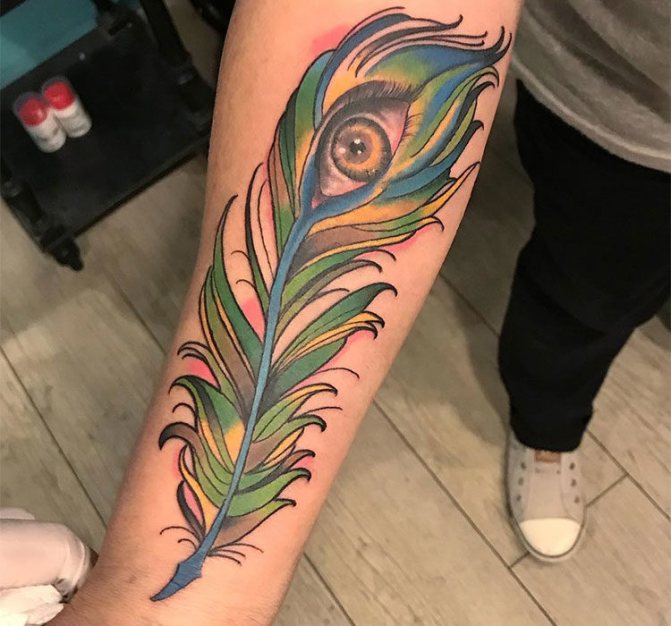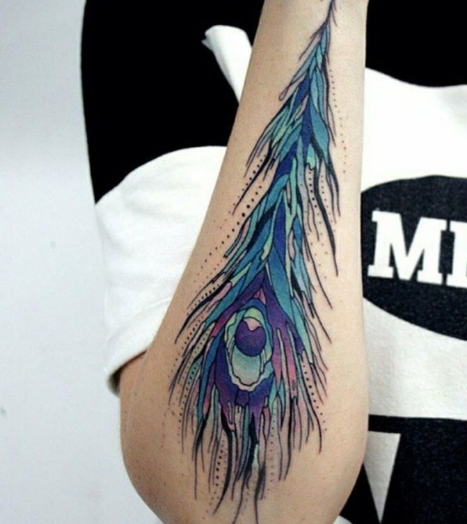 Un bel et grand oiseau peut former une manche entière. En plaçant une queue luxuriante et un cou délicat sur le corps, vous ne pouvez engager l'épaule que jusqu'à l'articulation du coude. La plume de paon est magnifique sur le dos d'une femme, entre les omoplates. Le haut ovale et le bas allongé créent une transition douce entre le dos large et étroit. Cela permet d'affiner la silhouette et de créer un look attrayant.
