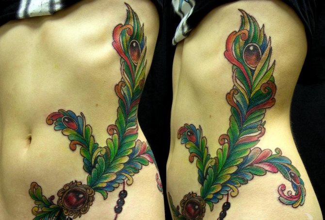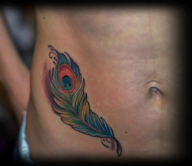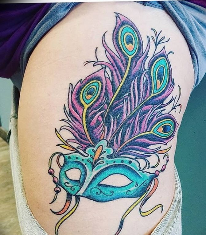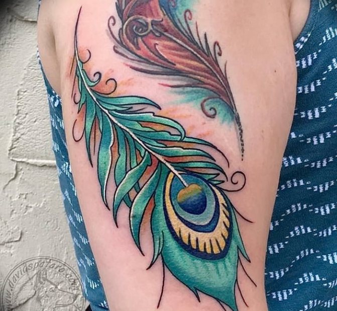 Un sultan de plumes peut décorer l'omoplate, la ligne d'épaule, le bas du dos ou la cuisse. La plasticité de la plume permet de façonner des lignes courbes et de former une perspective visuelle favorable. Une tête de paon encadrée de plumes est utilisée pour combler la zone au-dessus des seins chez les filles. Cela crée un look subtilement sexy rempli de notes captivantes d'attractivité.