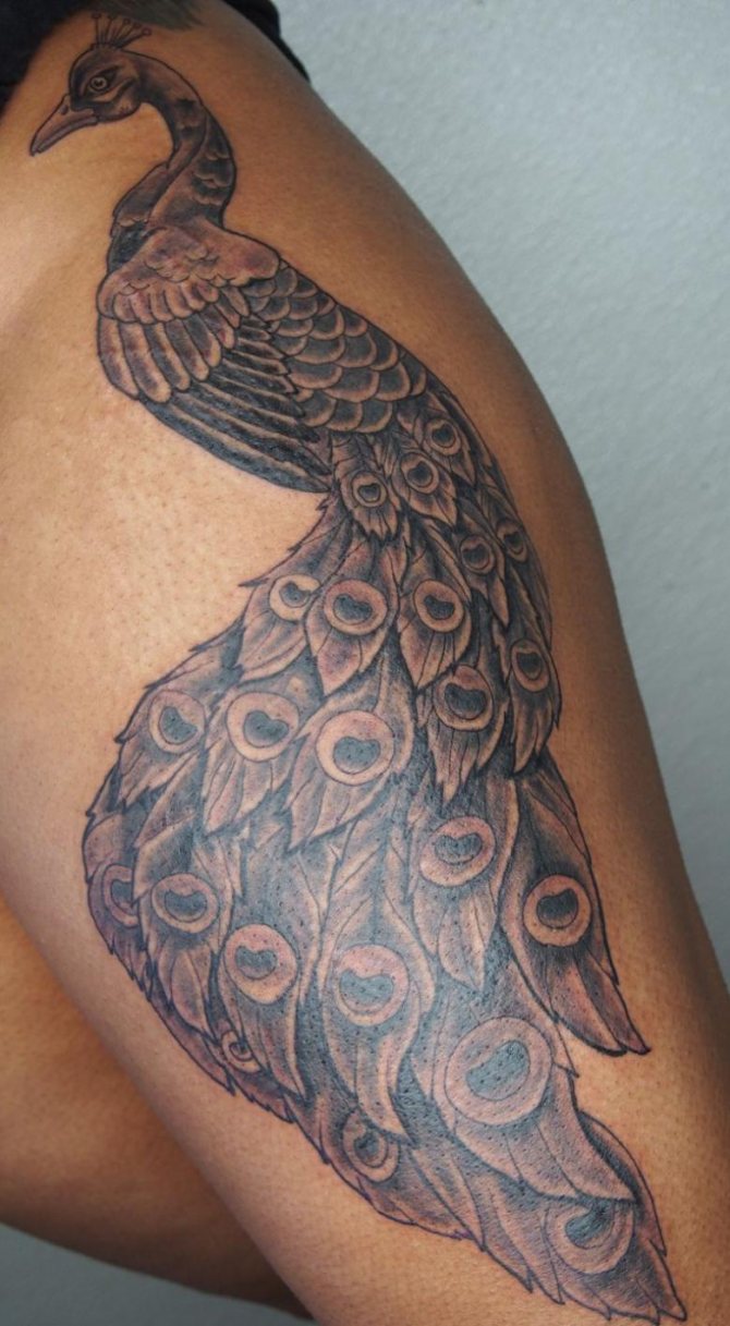 Le paon est un grand oiseau. Pour libérer tout le potentiel de l'image, il faut une grande surface de peau. Il est préférable de le faire tatouer sur la poitrine ou le dos. Pour les filles, il est préférable de le placer sur le côté du corps, puis sur la cuisse. Dans certains cas, elle n'occupe que la cuisse.