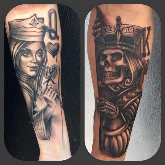 Le deuxième meilleur dans le jeu est le Roi. Un tatouage avec ce symbole représente un homme fort et volontaire.